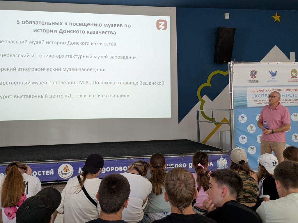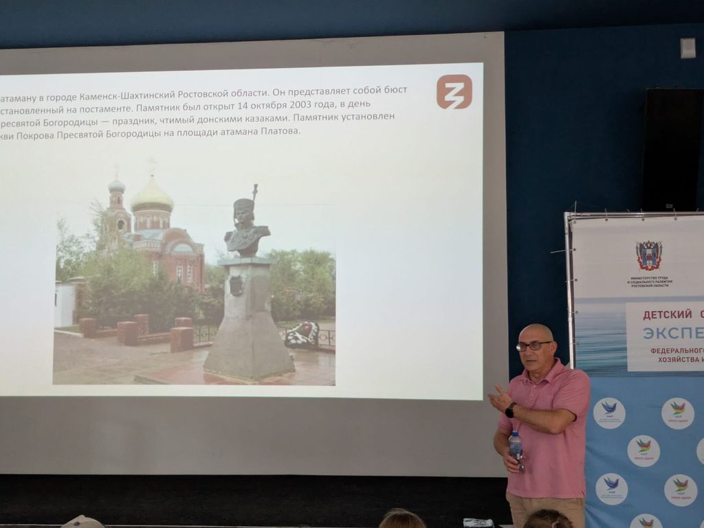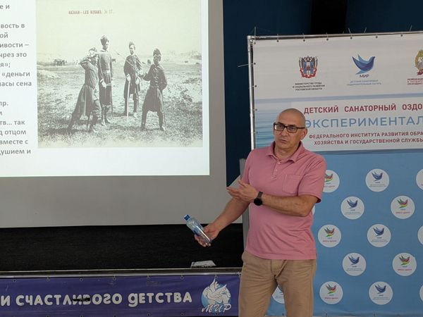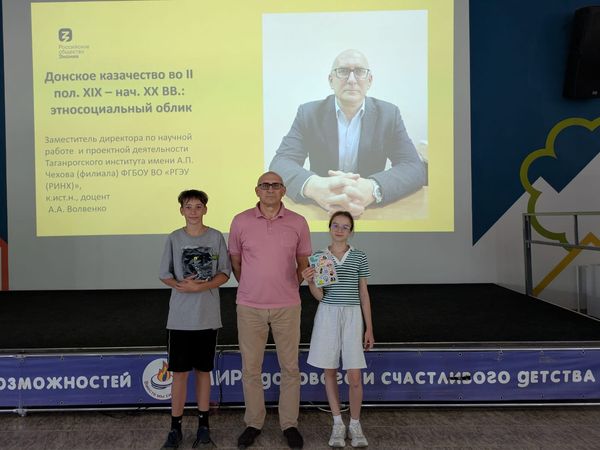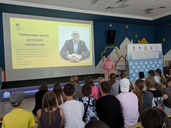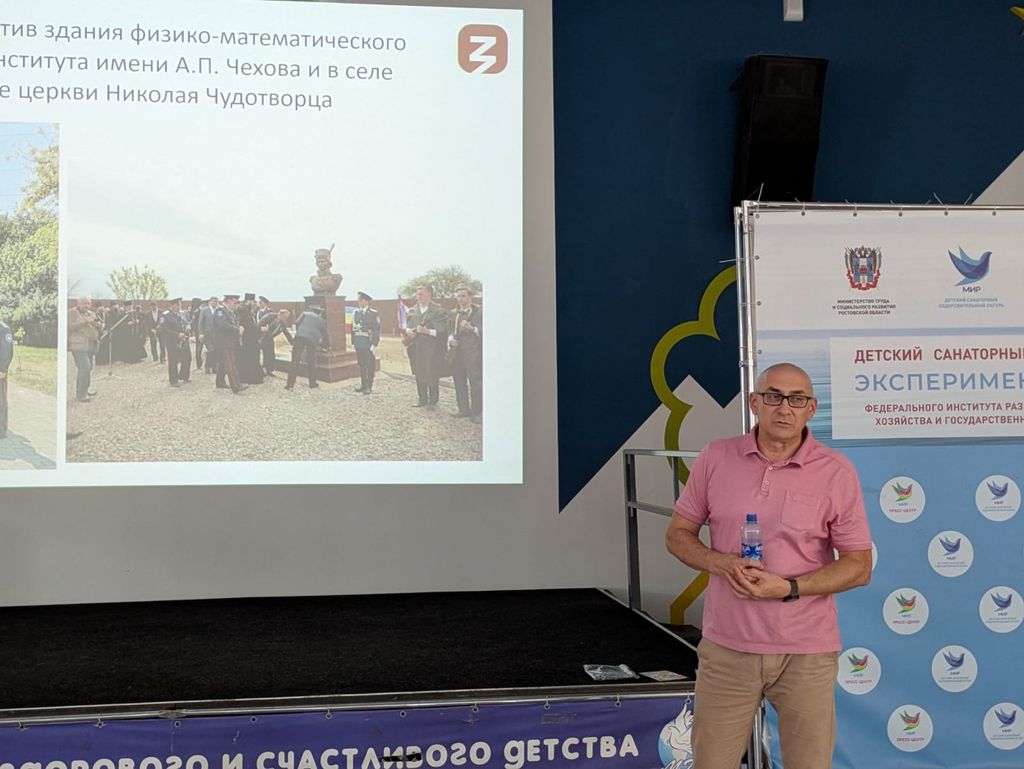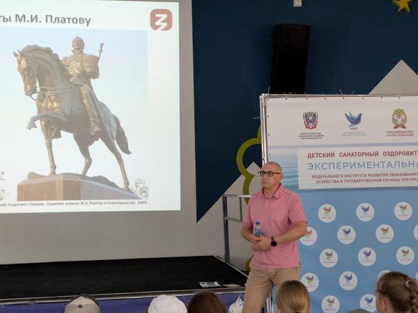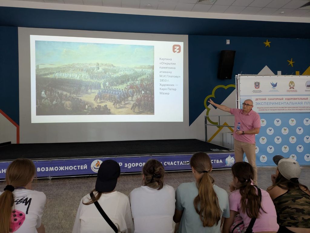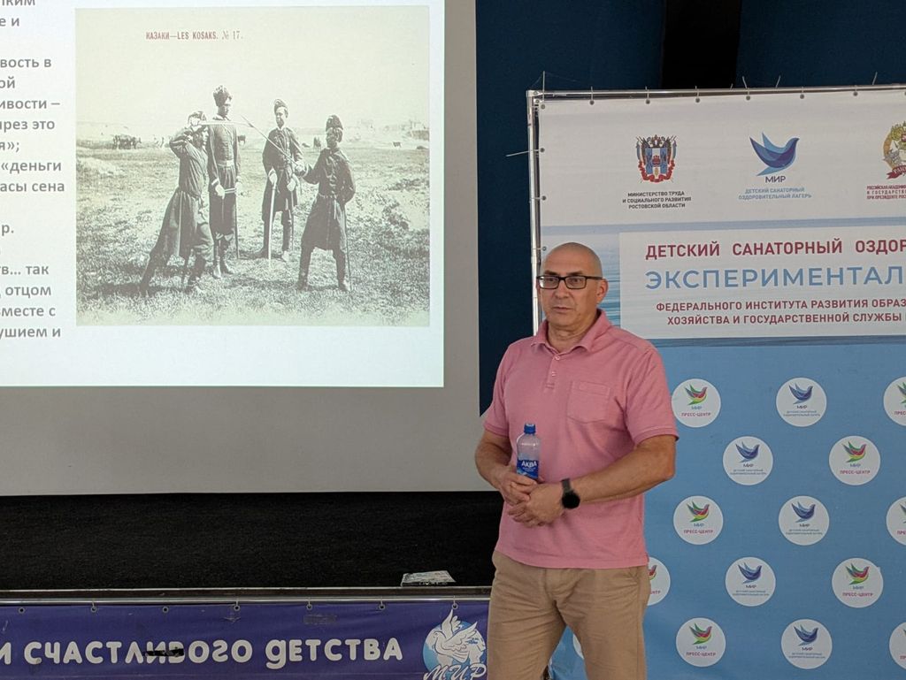 Новости все 01 августа, 2025 Сотрудничество научной лаборатории «Казачество в истории и памяти» факультета истории и филологии с Российским обществом «Знание»Филиал Российского общества «Знание» в Ростовской области (директор – канд. ист. наук Ж. С. Метелкина) уделяет большое внимание популяризации истории Донского казачества и развивает в этом направление взаимодействие с научной лабораторией «Казачество в истории и памяти» факультета истории и филологии. В рамках данного сотрудничества А. А. Волвенко – руководитель научной лаборатории, заместитель директора по научной работе и проектной деятельности Таганрогского института имени А.П. Чехова (филиала) РГЭУ (РИНХ), председатель общественного совета при Департаменте по делам казачества и кадетских учебных заведений РО, руководитель магистерской программы «Историческое образование в системе казачьих кадетских учебных заведений», кандидат исторических наук, доцент в качестве лектора Российского общества «Знание» представил серию лекций в детском санаторном оздоровительном лагере «Мир». В ходе лекций «Донское казачество во II половине XIX – начале XX веков: этносоциальный облик» и «Памятные места донского казачества» участники смены узнали много важных и познавательных фактов из истории казачества. Особое внимание во второй лекции Алексей Александрович уделил внимание памятникам, закреплявшим образ казака как защитника Отечества, увековечивающих память об атаманах (М. И. Платов, Я.П.Бакланова), и сохранению историко-культурного наследия донских казаков в музейных комплексах региона: Новочеркасский музей истории Донского казачества; Старочеркасский историко-архитектурный музей-заповедник; Раздорский этнографический музей-заповедник; Государственный музей-заповедник М. А. Шолохова; Культурно-выставочный центр «Донская казачья гвардия». |