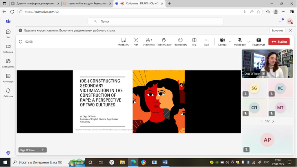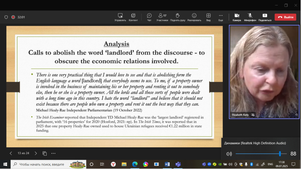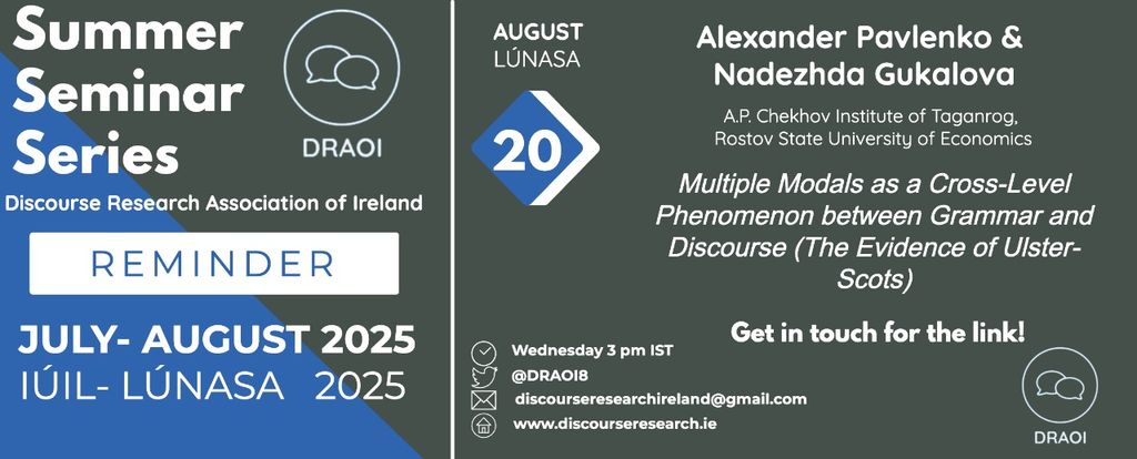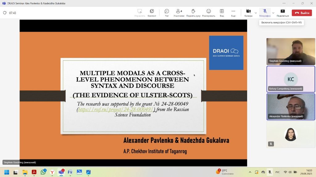 Новости все 01 сентября, 2025 Летние семинары Ирландской ассоциации исследований дискурса (DRAOI)Научная жизнь не затихает и летом, и одним из ярких событий этого года стала V-я серия международных летних семинаров, организованная Ирландской ассоциацией исследований дискурса (DRAOI). Подобные мероприятия проводятся Ассоциацией в июле и августе, начиная с 2021 г. Как и в предыдущие годы, организаторы принимали заявки от исследователей дискурса, которые живут в Ирландии (на севере и юге) и/или изучают различные дискурсы в ирландском контексте и на ирландском материале. При отборе лекций организаторы используют демократичной подход, давая возможность выступить как опытным, так и молодым исследователям. Ежегодная серия летних семинаров Ассоциации обеспечивает исследователям гостеприимную неформальную атмосферу, где они делятся результатами своей работы, обсуждают их с коллегами – представителями разных научных дисциплин, изучающих дискурс, и участвуют в продуктивных дискуссиях по широкому кругу смежных тем. Докладчики тут же в неофициальной и дружелюбной обстановке получают полезную и конструктивную обратную связь. В этом году первая лекция состоялась 9-го июля. На каждое выступление отводится астрономический час, но, как показывает опыт, регламент семинаров достаточно гибкий. Формат презентаций варьируется в зависимости от представляемых материалов и может включать: · обзор запланированного/текущего исследовательского проекта или краткое изложение результатов; · беседу о книге (на любой стадии работы); · краткое содержание недавней публикации; · презентацию конференции; · семинар/учебник по конкретному дисциплинарному или методологическому подходу к исследованию дискурса; · обзор диссертаций. Тематика семинаров широка и включает такие разделы, как: · критический анализ/исследования дискурса; · теория дискурса; · социолингвистика; · прагматика; · мультимодальные и/или цифровые дискурсы; · Дискурс, язык и идеология. Многими выступающими рассматривается дискурс с определенной тематической направленностью, такой, например, как экономика, промышленность, устойчивое развитие, гендер и сексуальность, управление и политика, СМИ, образование, этика, социология, коммуникация, изменение климата и др. Все семинары проводятся онлайн, что позволяет участвовать в них исследователям, изучающим ирландские дискурсы, в том числе, далеко за пределами Ирландии. Так, 28-го августа с лекцией на тему своего проекта, поддержанного грантом РНФ, успешно выступили профессор кафедры английского языка А.Е. Павленко и преподаватель ИТА ЮФУ Н.В. Гукалова. После выступления состоялось его заинтересованное обсуждение, в ходе которого представленный материал получил одобрительные отзывы и конструктивные рекомендации. Выражаем благодарность организаторам летней серии семинаров DRAOI д-ру Стивену Гульдингу и аспирантке Келси Камполонг за возможность принять участие в данном масштабном научном мероприятии и за отбор интересных по своей тематике лекций. |