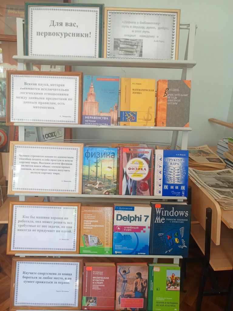 Новости все 01 сентября, 2025 Нас книга к вершинам познанья ведёт1 сентября – праздник всех, кто учится и учит. Также этот день считается праздничным и в библиотеках, ведь он является олицетворением новых знаний и открытий, новых интересных учебных проектов, новых творческих идей. Учиться можно и нужно с увлечением – и в этом студентам помогут книги наших выставок. Здесь можно познакомиться с учебной и научно-популярной литературой, с удивительными энциклопедиями, вобравшими в себя знания из самой древности и до наших дней. Самые пытливые умы найдут в книгах ответы на свои вопросы из области физики и химии, анатомии и астрономии, и других областей знаний. К Всемирному Дню знаний и началу учебного года, а также в рамках «Дней первокурсника» в отделах библиотеки Таганрогского института имени А.П.Чехова (филиала) РГЭУ (РИНХ) подготовлены книжные выставки, где представлены издания из библиотечного фонда вуза. Посетив выставки в отделах библиотеки, первокурсники смогут легко сориентироваться, где можно получить учебники, где поработать с журналами, а куда обратиться за интересной художественной книгой. С 1 сентября до 12 сентября 2025 года на абонементах и в читальных залах библиотеки для первокурсников действуют выставки литературы: