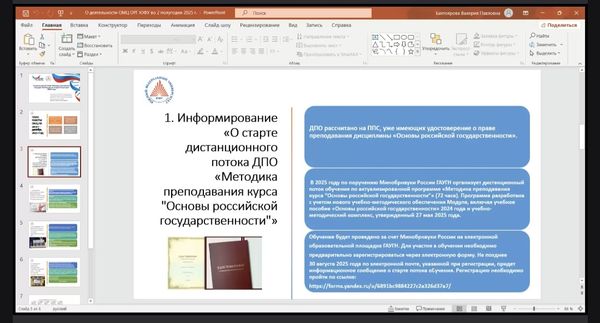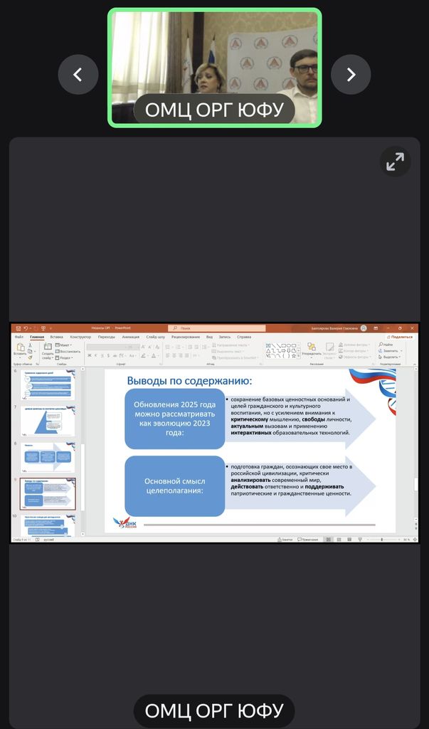 Новости все 01 сентября, 2025 Участие факультета экономики и права в круглом столе, посвященном обсуждению обновленного УМК по курсу «Основы российской государственности»29 августа 2025 г. на базе Регионального опорно-методического центра «Основы российской государственности» Южного федерального университета в дистанционном формате был проведен круглый стол «Нюансы ведения курса «Основы российской государственности» в 2025/26 учебном году с учетом актуализированной концепции УМК по дисциплине», в котором приняла участие канд. филос. наук, доцент кафедры экономики и гуманитарно-правовых дисциплин В.А. Тимофеенко. В рамках мероприятия были рассмотрены вопросы, касающиеся содержательных изменений в новой концепции УМК, особенностей проведения учебных занятий в 2025/26 учебном году, а также вынесены на обсуждение методики преподавания, обмен опытом между представителями опорно-методического центра, пути реализации курса с учетом формирующегося ядра социогуманитарных дисциплин. В обсуждении приняли участие представители профессорско-преподавательского состава вузов РФ, реализующих курс ОРГ, сотрудники научных и общественных институтов России. В завершении присутствующие отметили необходимость привлечения студентов к участию во Всероссийском конкурсе студенческих проектов по теме «Российская государственность». |