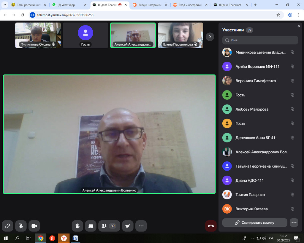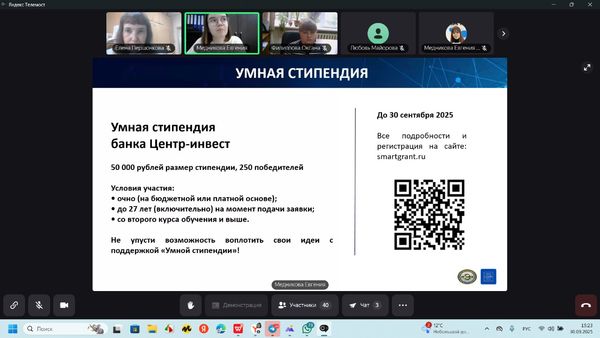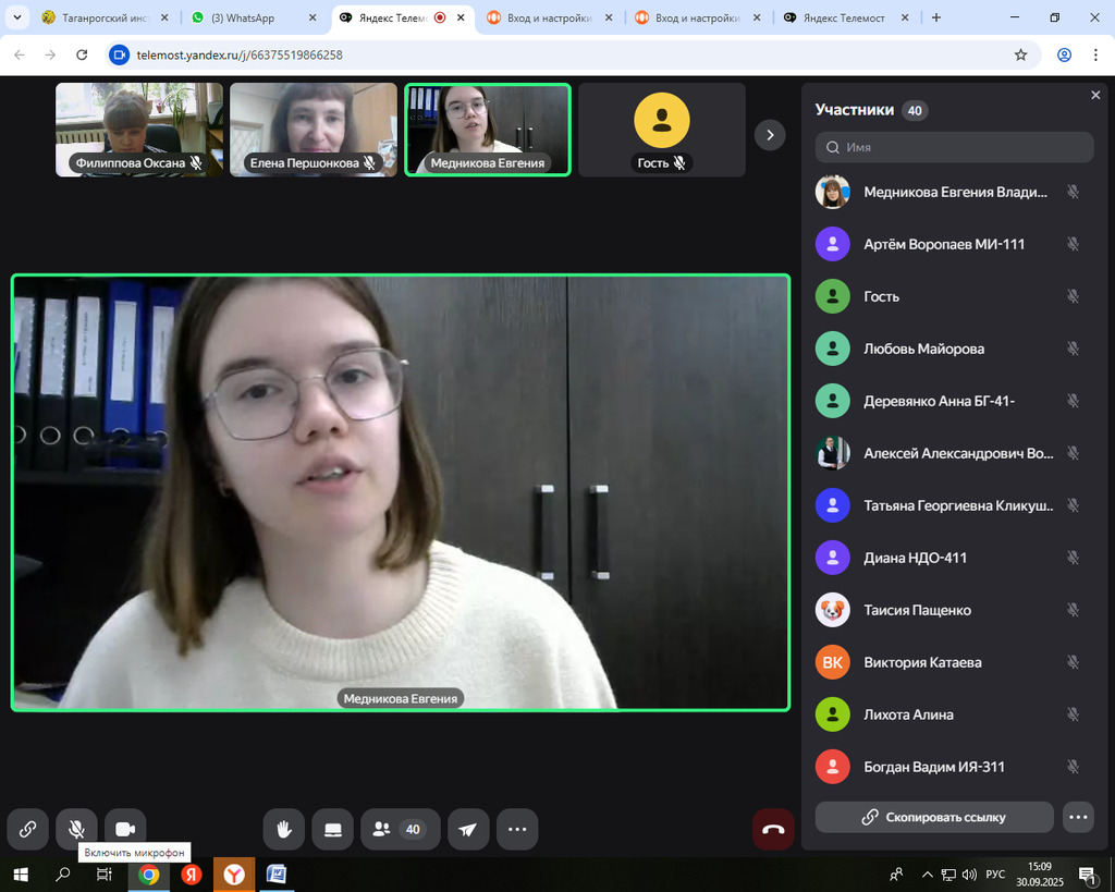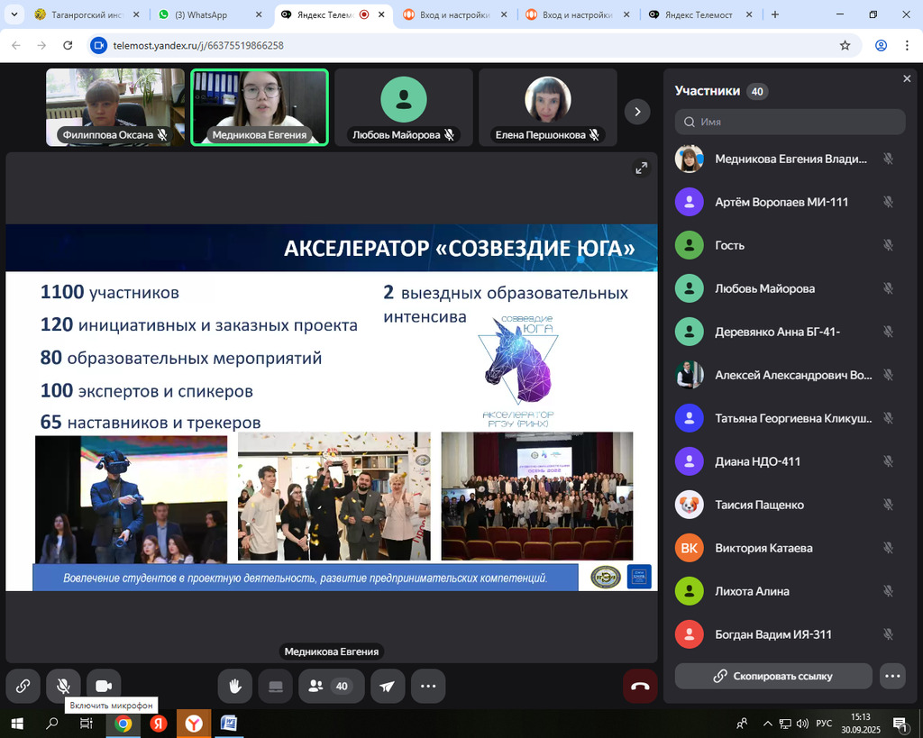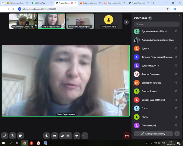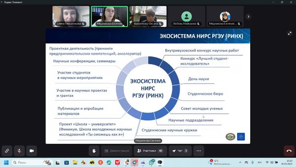 Новости все 01 октября, 2025 Заседание Студенческого научного общества Таганрогского института имени А.П. Чехова (филиала) РГЭУ (РИНХ) для студентов 1-го курса30 сентября 2025 года в онлайн-формате состоялось заседание СНО для студентов 1-го курса всех профилей Таганрогского института имени А.П. Чехова (филиала) РГЭУ (РИНХ). Мероприятие носило ознакомительный характер и было посвящено знакомству первокурсников со спецификой деятельности Студенческого научного общества Таганрогского института имени А.П. Чехова (филиала) РГЭУ (РИНХ). Модератором мероприятия выступила заместитель начальника отдела организации и сопровождения научной деятельности, кандидат педагогических наук, доцент Елена Алексеевна Першонкова, которая рассказала об основных направлениях работы СНО на факультетах. В начале мероприятия выступил с приветственным словом заместитель директора по научной работе и проектной деятельности, кандидат исторических наук, доцент Алексей Александрович Волвенко, подчеркнувший важность участия студентов в научно-исследовательской деятельности и стартап-проектировании. Начальник отдела организации и сопровождения научной деятельности, кандидат филологических наук, доцент Оксана Николаевна Филиппова отметила, что СНО – это первый шаг для студентов в большую науку, возможность проявить себя. Заместитель председателя Совета молодых ученых РГЭУ (РИНХ) Евгения Владимировна Медникова подробно рассказала об экосистеме научно-исследовательской работы студентов РГЭУ (РИНХ), об актуальных конкурсах, конференциях, проектной деятельности. В мероприятии приняли участие первокурсники разных факультетов института, руководители СНК и СНО. |