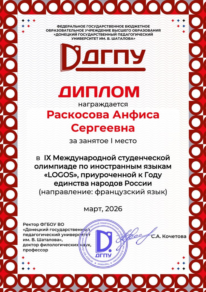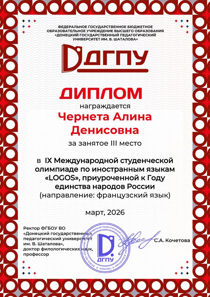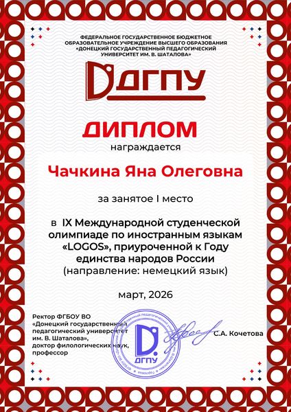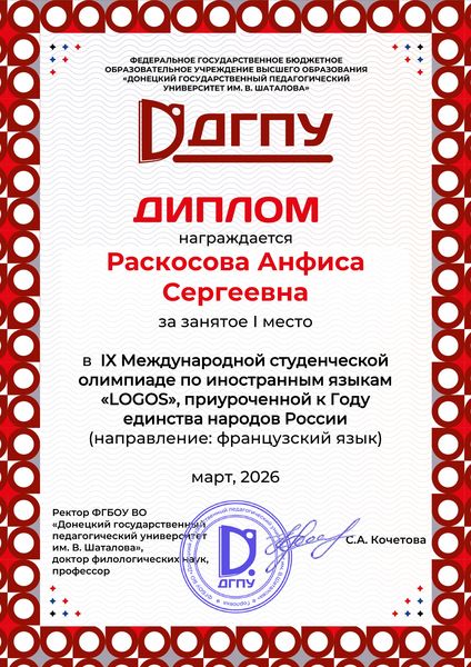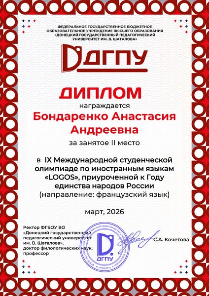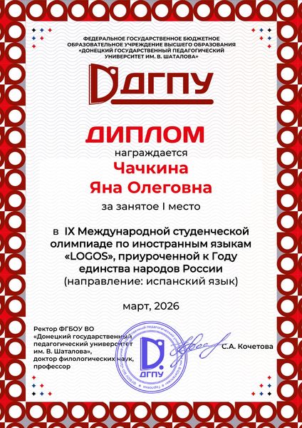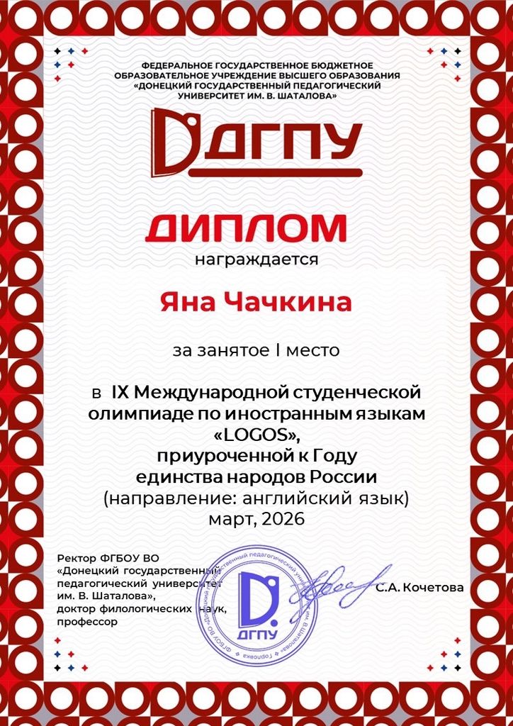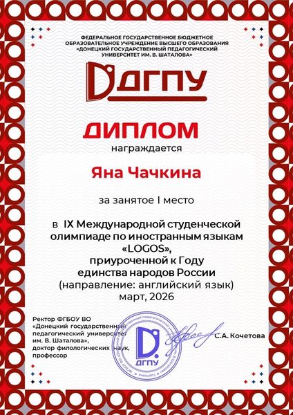Новости все 06 апреля, 2026 Итоги IX Международной студенческой олимпиады по иностранным языкам «LOGOS»С 07 по 30 марта 2026 года в ФГБОУ ВО «Донецкий государственный педагогический университет им. В. Шаталова» проходила IX Международная студенческая олимпиада по иностранным языкам «LOGOS», приуроченная к Году единства народов России. Олимпиада послужила платформой, предоставившей студентам образовательных учреждений различных уровней возможность продемонстрировать свои компетенции в английском, испанском, немецком и французском языках. В этом году в Олимпиаде приняли участие студенты из 30 организаций высшего и среднего профессионального образования различных субъектов Российской Федерации, а также Приднестровской Молдавской Республики, Азербайджана, Беларуси, Узбекистана. В ходе первого этапа состязания участникам предстояло продемонстрировать свои компетенции в области лексико-грамматических аспектов иностранного языка, а также навыки аудирования и чтения иноязычных текстов. В творческой видеоработе второго тура перед студентами стояла задача показать миру силу и многогранность уникальных традиций и истории родного края. Члены жюри оценивали фонетическое и грамматическое оформление речи, её темп, структуру и лексическое наполнение текста. При этом должное внимание уделялось также коммуникативной направленности презентации, её стилю и оригинальности, степени раскрытия содержания. Среди участников и победителей олимпиады есть студенты факультета иностранных языков. Пальму первенства традиционно в руках у Чачкиной Яны, гр. ИЯ-351. Яна стала победителем в трех направлениях: «Английский язык», I место, 95,8 балла. «Немецкий язык», I место, 92,8 балла. «Испанский язык», I место, 93,0 балла. В направлении «Французский язык»: I место – Раскосова Анфиса, гр.ИЯ-342 – 98,0 балла; II место – Бондаренко Анастасия, гр.ИЯ-342 – 88,4 балла; Максименко Влада, гр. ПЕР-341 – 88,8 балла; III место –Чернета Алина, гр.ИЯ-342 – 84,0 балла. Выражаем искренние поздравления всем победителям и призёрам, а также их наставникам, чья поддержка и руководство сыграли ключевую роль в достижении этих успехов. Желаем новых побед и дальнейшего развития продуктивного взаимодействия студентов и преподавателей в области научных исследований и образовательных инициатив! |