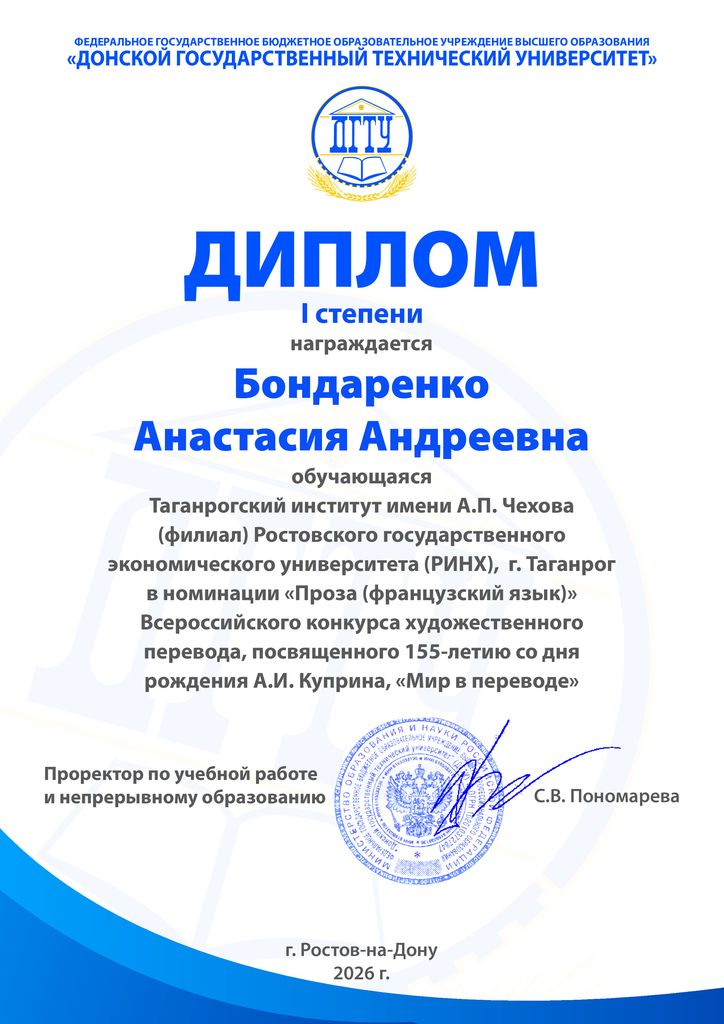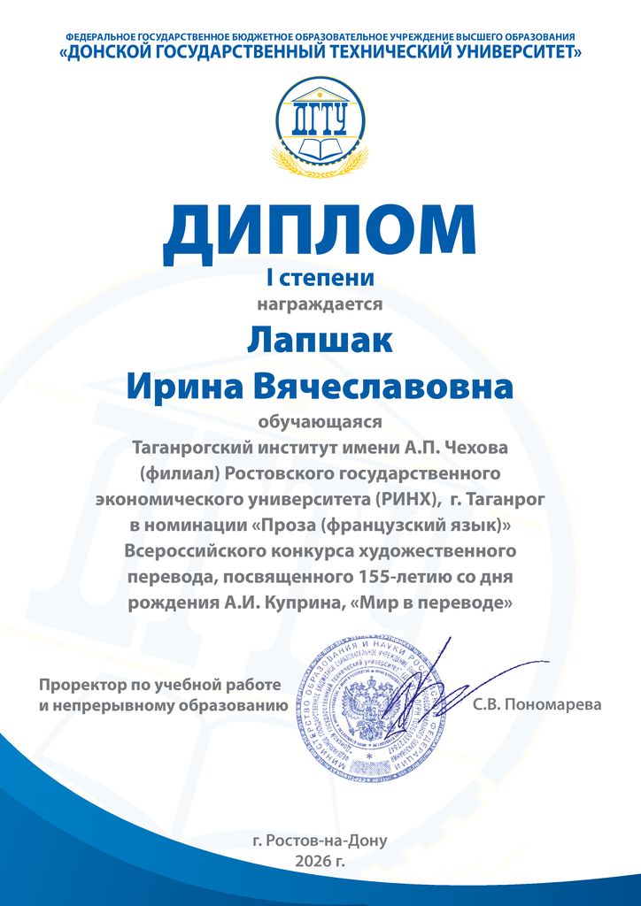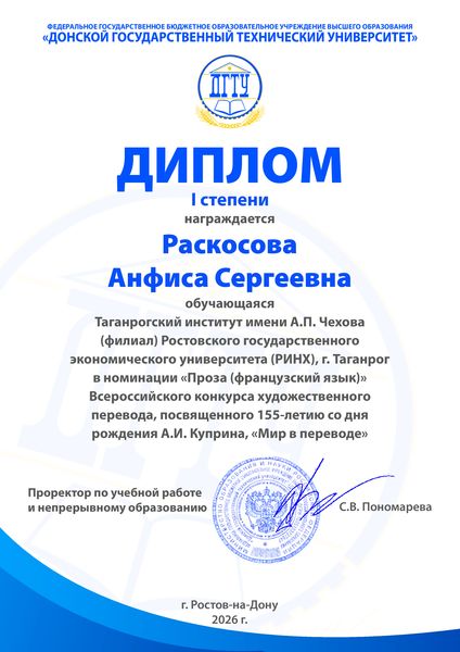 Новости все 06 апреля, 2026 Итоги Всероссийского конкурса художественного перевода «Мир в переводе»Всероссийский конкурс художественного перевода "Мир в переводе", посвященный 155-летию со дня рождения А.И. Куприна, завершён. Конкурс собрал более 250 участников, – обучающихся образовательных организаций среднего, среднего профессионального и высшего образования из разных городов России ( г. Москва, г. Санкт-Петербург, г. Уфа, г. Омск, г. Краснодар и др.), выполнивших художественный перевод бессмертного произведения А.И. Куприна "Гранатовый браслет", с языка оригинала на английский, немецкий, французский и испанский языки. Среди участников и, главное, победителей – студенты факультета иностранных языков. В номинации «Французский язык» I место заняли Раскосова Анфиса, Бандаренко Анастасия, Лапшак Ирина (гр.ИЯ-342). Кафедра немецкого и французского языков поздравляет победителей и желает дальнейших творческих свершений. |