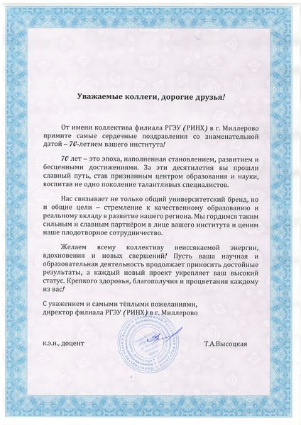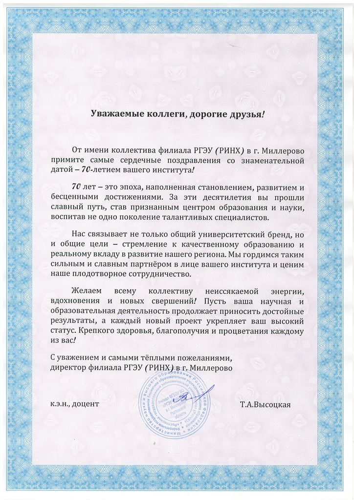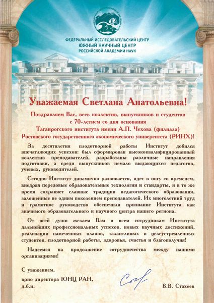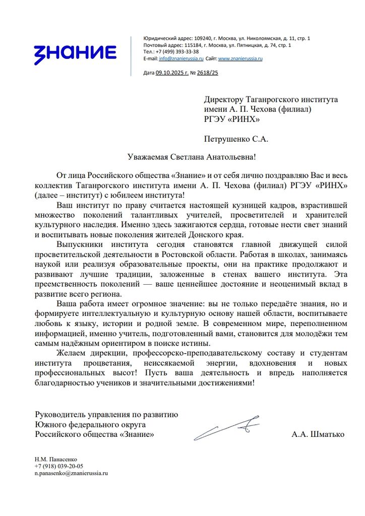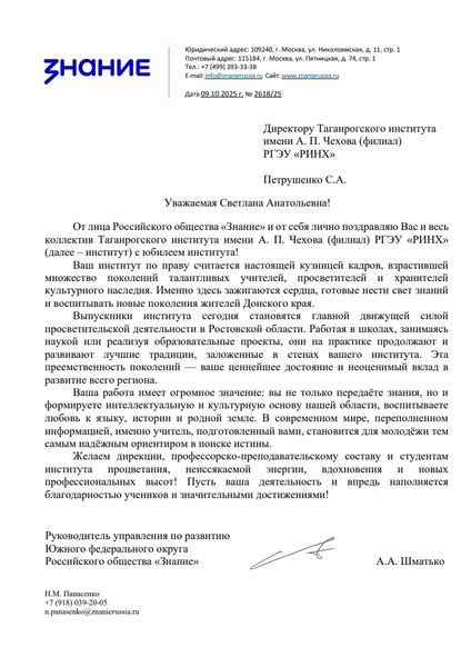 Новости все 09 октября, 2025 ПОЗДРАВЛЕНИЕ С 70-ЛЕТИЕМ ТАГАНРОГСКОГО ИНСТИТУТА ИМЕНИ А.П.ЧЕХОВА (ФИЛИАЛА) РГЭУ (РИНХ) ОТ КОЛЛЕГ И ПАРТНЕРОВ |