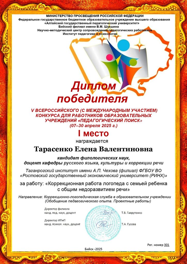 Новости все 12 мая, 2025 Доцент Тарасенко Елена Валентиновна – победитель Всероссийского конкурса «Педагогический поиск»В Институте педагогики и психологии Бийского филиала им. В.М. Шукшина АлтГПУ завершился V Всероссийский (с международным участием) конкурс для работников образовательных учреждений «Педагогический поиск» (07-30 апреля 2025 г.) организуемый научно-методическим центром сопровождения педагогических работников и кафедрой педагогики и психологии. На конкурс поступило 310 работ от педагогических работников высшего и среднего профессионального образования, учреждений дополнительного образования, педагогов школ, гимназий и детских садов. География участников конкурса широкая: СНГ (Республика Беларусь, Республика Казахстан), города федерального значения РФ (г. Москва, г. Санкт-Петербург) и 49 субъектов РФ. В этом году 24 работы стали абсолютными победителями конкурса и получили Гран-при. Среди них доцент кафедры русского языка, культуры и коррекции речи Тарасенко Е. В. в номинации «Коррекционно-логопедическая служба в образовательном учреждении (Обобщение педагогического опыта. Проектные работы)». Поздравляем Елену Валентиновну Тарасенко и желаем дальнейших творческих успехов и вдохновения! |