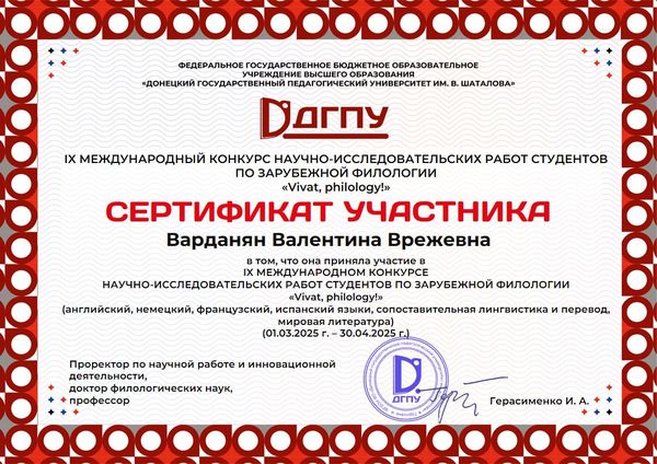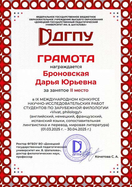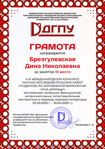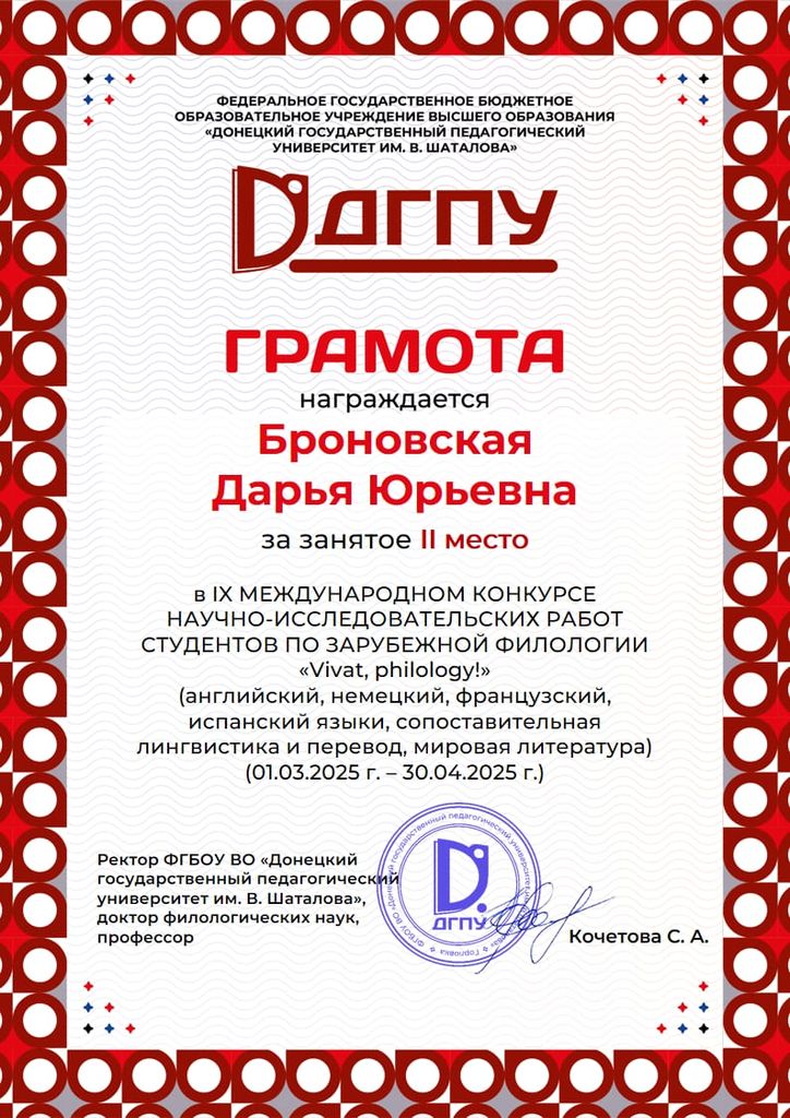 Новости все 15 мая, 2025 Итоги IX Международного конкурса научно-исследовательских работ студентов по зарубежной филологии «Vivat, philology!»В ФГБОУ ВО «Донецкий государственный педагогический университет им. В. Шаталова» подведены итоги IX Международного конкурса научно-исследовательских работ студентов по зарубежной филологии «Vivat, philology!» (направления: английский, немецкий, французский языки, сопоставительная лингвистика и перевод, мировая литература). Традиционно в конкурсе приняли участие студенты из вузов Российской федерации: ФГБОУ ВО «Мордовский государственный педагогический университет имени М. Е. Евсевьева, ФГБОУ ВО «Армавирский государственный педагогический университет», ФГБОУ ВО «Алтайский государственный педагогический университет», ГОУ ВО МО «Государственный социально-гуманитарный университет», ФГАОУ ВО «Белгородский государственный национально-исследовательский университет», ФГБОУ ВО «Мариупольский государственный университет имени А.И. Куинджи», ФГБОУ ВО «Донецкий государственный педагогический университет им. В. Шаталова», Таганрогский институт имени А. П. Чехова (филиал) РГЭУ (РИНХ)», а также вузов Республики Узбекистан, Приднестровской Молдавской Республики. Участники конкурса предоставили уже апробированные работы по направлениям: английский язык, немецкий язык, французский язык, сопоставительная лингвистика и перевод, мировая литература. В результате проверки конкурсных работ жюри определило победителей, среди которых студенты факультета иностранных языков Таганрогского института имени А.П. Чехова! Французский язык: II место – Броновская Дарья Юрьевна, гр.ИЯ-322, III место – Брезгулевская Диана Николаевна, гр.ИЯ-322. Члены жюри отметили высокий уровень научно-исследовательских работ студентов, актуальность и практическую направленность научных сочинений, а также инновационный подход в методической презентации исследований. Кафедра немецкого и французского языков поздравляет девочек, желает им дальнейшего научного и творческого роста и новых побед! |