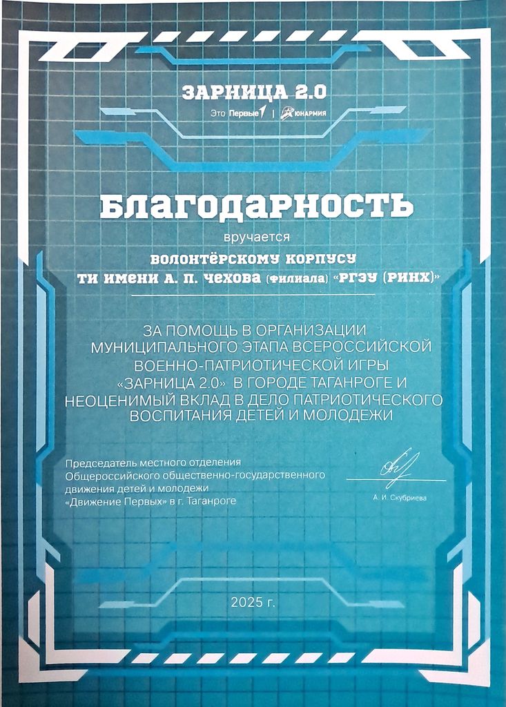 Новости все 17 апреля, 2025 Волонтеры Таганрогского института имени А.П. Чехова (филиала) РГЭУ (РИНХ) - участники церемонии закрытия муниципального этапа Всероссийской военно-патриотической игры «Зарница 2.0»Весной 2025 года в городе Таганроге состоялся муниципальный этап Всероссийской военно-патриотической игры «Зарница 2.0», волонтерское сопровождение в котором обеспечивали волонтеры Таганрогского института имени А.П. Чехова. Организаторами игры были региональное отделение Общероссийского общественно-государственного движения детей и молодежи «Движение Первых» Ростовской области и Таганрогское Муниципальное Отделение «Юнармия» при поддержке Администрации Президента Российской Федерации и Администрации города Таганрога. 16 апреля 2025 года на площадке информационно-выставочного центра военно-исторического музейного комплекса «Самбекские высоты» состоялась торжественная церемония закрытия муниципального этапа «Зарницы 2.0». Почетными гостями мероприятия стали заместитель начальника Управления образования города Таганрога В.В. Стаценко, заместитель главы Администрации по социальным вопросам И.В. Голубева, начальник Управления образования города Таганрога О.Л. Морозова, председатель Комитета по физической культуре и спорта С.А. Смородинова, начальник Управления культуры Е.Б. Шелухина, начальник муниципального штаба движения «Юнармия» А.В. Шкурко, директор МБУ ДО «Центр технического творчества», руководитель УМЦ «Аванград» Д.В. Земляненко, президент военно-спортивного клуба «Ставрос» О.И. Овчаренко, а также финалисты муниципального этапа «Зарницы 2.0», наставники команд, социальные партнеры. В рамках мероприятия председатель местного отделения Общероссийского общественно-государственного движения детей и молодежи «Движение Первых» в городе Таганроге А.И. Скубриева вручила благодарственное письмо волонтерам Таганрогского института имени А.П. Чехова за неоценимый вклад в дело патриотического воспитания детей и молодежи. Также на церемонии закрытия состоялась процедура награждения победителей муниципального этапа военно-патриотической игры «Зарница 2.0». В завершении мероприятия участники посетили выставки музейного комплекса и возложили цветы к скульптурным композициям военно-исторического музейного комплекса «Самбекские высоты». |