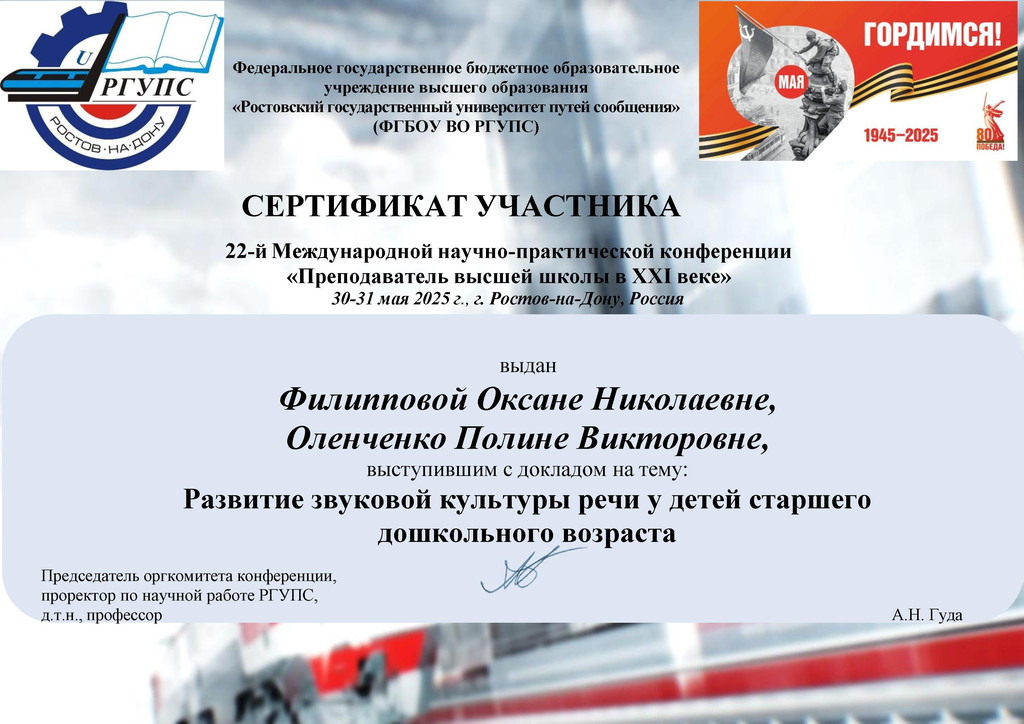 Новости все 17 июня, 2025 Международная научно-практическая конференция «Преподаватель высшей школы в XXI веке»30-31 мая 2025 года в Ростовском государственном университете путей сообщения состоялась 22-я Международная научно-практическая конференция «Преподаватель высшей школы в XXI веке». Мероприятие было направлено на развитие образовательной и научной деятельности в высшей школе, а также укрепление профессиональных связей. В конференции приняли участие начальник отдела организации и сопровождения научной деятельности, кандидат филологических наук, доцент О.Н. Филиппова и студентка группы НДО-441 Оленченко Полина. Конференция прошла в смешанном формате, по ее итогам будет издан сборник материалов с регистрацией в РИНЦ. |