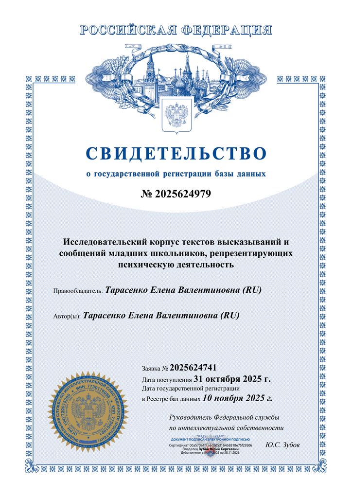 Новости все 18 ноября, 2025 Регистрация базы данных исследовательского корпуса текстов младших школьников в РоспатентеДоцент кафедры русского языка, культуры и коррекции речи Е. В. Тарасенко зарегистрировала в Федеральной службе по интеллектуальной собственности (Роспатент) базу данных «Исследовательский корпус текстов высказываний и сообщений младших школьников, репрезентирующих психическую деятельность». |