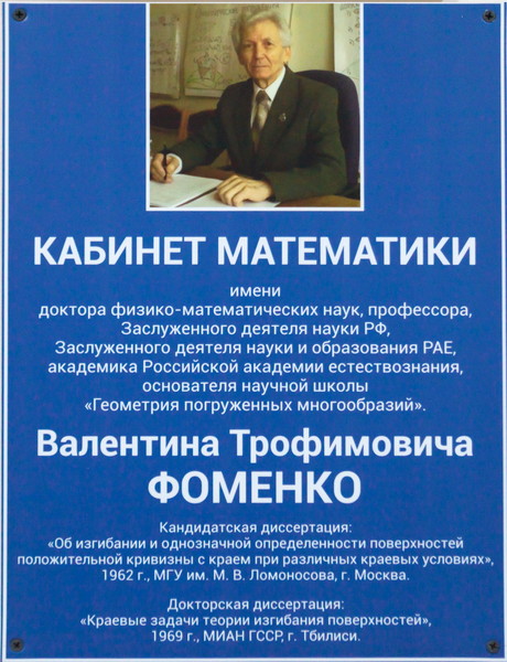 Новости все 19 июня, 2025 Открытие кабинета, посвященного памяти доктора физико-математических наук, профессора Валентина Трофимовича Фоменко18 июня 2025 года на факультете физики, математики, информатики Таганрогского института имени А.П. Чехова (филиала) ФГБОУ ВО «РГЭУ (РИНХ)» прошло открытие кабинета, посвященного памяти доктора физико-математических наук, профессора, Заслуженного деятеля науки РФ, Заслуженного деятеля науки и образования РАЕ, академика Российской академии естествознания, основателя научной школы «Геометрия погруженных многообразий» Валентина Трофимовича Фоменко. Валентина Трофимовича не стало 6 февраля этого года. За 4,5 месяца благодаря помощи и поддержке руководства института, непосредственному участию декана факультета физики, математики, информатики Сергею Александровичу Донских, студентов групп ДОПZ-441 и ДОПZ-451 факультета дошкольного, начального и дополнительного образования института был организован кабинет: собраны материалы о жизни Валентина Трофимовича, его научной и учебной работе, преподавательской деятельности. Содержательная компонента кабинета – Человек, Ученый, Учитель. С вступительным словом выступили кандидат исторических наук, доцент, помощник директора по научной работе и проектной деятельности А.А. Волвенко и кандидат технических наук, доцент, декан факультета физики, математики и информатики С.А. Донских. На открытии кабинета присутствовали члены Ученого совета института, преподаватели, гости. Наталья Васильевна Фоменко рассказала о детских и юношеских годах Валентина Трофимовича, увлечениях и значении математики, точнее геометрии, в его жизни. О Валентине Трофимовиче как известном во всем мире ученом, его вкладе в развитие геометрии рассказал доктор физико-математических наук, профессор Александр Алексеевич Илюхин. На открытии присутствовал один из первых учеников Валентина Трофимовича – кандидат физико-математических наук, доцент кафедры математического анализа и геометрии ЮФУ Виталий Всеволодович Казак. Он рассказал о Валентине Трофимовиче, как о талантливом преподавателе, учителе, который прочел более 30 различных курсов, подготовил 27 кандидатов наук, из них четверо защитили докторские диссертации. Ученики Валентина Трофимовича неоднократно были отмечены наградами на конкурсах и конференциях. Под научным руководством профессора В.Т. Фоменко выполнено более 300 дипломных работ. В заключение мероприятия присутствующие посмотрели выступление Валентина Трофимовича «Оприорные оценки решений уравнений изгибаний поверхностей», сделанное на конференции «Современные методы и проблемы теории операторов и гармонического анализа и их приложения III», посвященной памяти профессора Игоря Борисовича Симоненко, которая проходила 1 – 6 июня 2013 года в ЮФУ. |