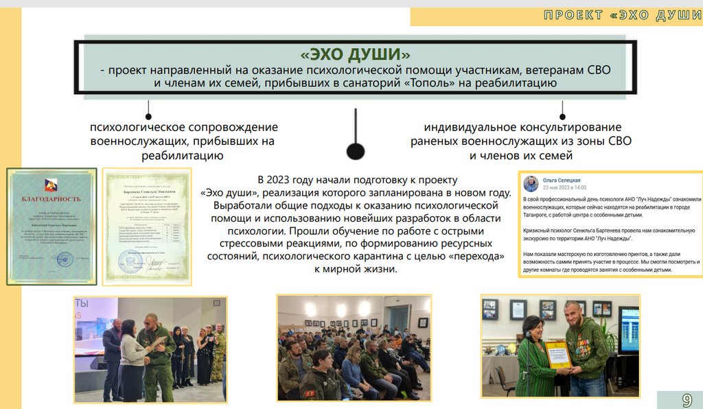 Новости все 21 января, 2025 Итоги проекта «Эхо души», реализованного кафедрой психологии совместно с АНО «Луч Надежды» в течение 2024 г.Кафедра психологии совместно с коллективом АНО «Луч Надежды» подводит итоги одного из актуальных и социально значимых проектов 2024 г. – проекта «Эхо Души». У истоков создания стояли директор АНО «Луч Надежды», ст. преп. кафедры психологии С.Э. Бартенева, руководитель волонтеров-психологов Ростовской области С.Р. Асатуров, зав. кафедрой психологии О.А. Холина, настоятель Ильинского храма отец Павел (Дудоладов), зам. командира 2 противотанкового артиллерийского взвода 2 противотанковой артиллерийской батареи противотанкового дивизиона отдельной Гвардейской артиллерийской бригады «Кальмиус», гвардии старший сержант С.В. Шалимов. «Эхо Души» – это проектная инициатива, направленная на оказание психологической помощи участникам, ветеранам Специальной военной операции и членам их семей, прибывших на реабилитацию в санаторий «Тополь», является одним из примеров межведомственного взаимодействия, объединения практиков, представителей научного сообщества и духовенства, демонстрации профессиональных компетенций волонтёров в практической плоскости, была начата в 2023 г. Организаторы и психологи-волонтеры прошли обучение по работе с острыми стрессовыми реакциями, по формированию ресурсных состояний, психологического карантина. В течение календарного года команда проекта «Эхо Души» принимала активное участие в работе 5 заездов в феврале-марте, марте-апреле, мае-июне 2024 г., затем проект был продолжен в рамках сотрудничества с командой проекта «Жизнь под парусом» (руководитель – депутат Городской Думы г. Таганрога Е.В. Сирота), в ноябре-декабре 2024 г. Кафедру психологии в проекте представляли зав. кафедрой О.А Холина, ст. преп. С.Э. Бартенева, доц. Т.И. Меньшикова, 20 волонтёров-психологов из числа студентов, обучающихся по магистерской программе «Юридическая психология», программам бакалавриата «Психологическое консультирование и коучинг», «Психология и педагогика инклюзивного образования», принимавшие участие в психологическом сопровождении и консультировании военнослужащих, прибывших в санаторий «Тополь». В течение 2024 г. было опубликовано 24 информационных заметки в сообществе АНО «Луч Надежды», 5 новостных заметок на сайте ТИ имени А.П. Чехова. Реализация проекта «Эхо Души» включала также организацию практических семинаров для волонтёров на площадке АНО «Луч Надежды», в рамках которых наставники С.Р. Асатуров, О.А. Холина, С.Э. Бартенева, о. Павел (Дудоладов) представили возможности классических психологических инструментов и новых достижений науки в области организации психологической помощи участникам специальной военной операции, членам их семей и обсуждали с волонтёрами тематические кейсы по управлению конфликтами. Участники проекта «Эхо Души» в рамках Урока мужества встретились со студентами кафедры психологии и рассказали студентам-психологам о важности их будущей профессии. В ходе коррекционно-развивающих занятий и сессий активно применялись элементы арт-терапии. Важным событием стало награждение юбилейным орденским знаком «10 лет РООИ «Русичи-Центр» за участие во Всероссийской благотворительной акции «Своих не бросаем!» С.Р. Асатурова, С.Э. Бартеневой; медалью «За бескорыстие» –