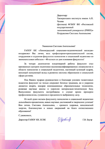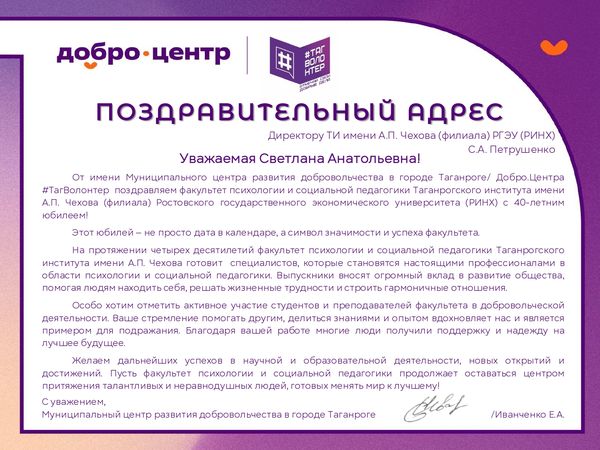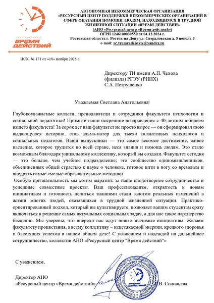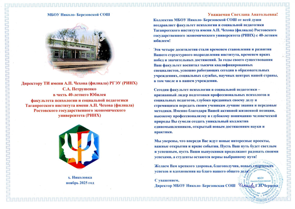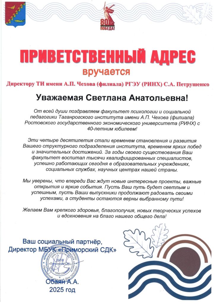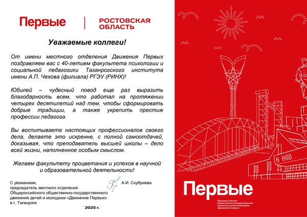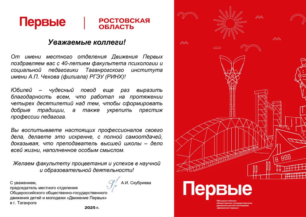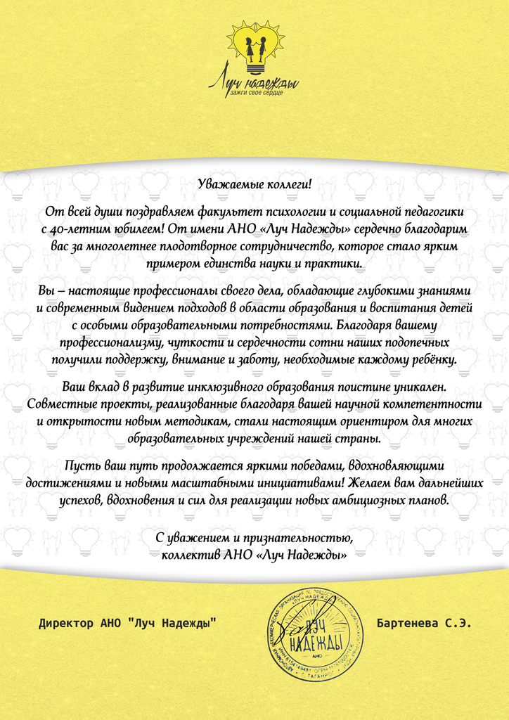Новости все 21 ноября, 2025 Приветственные адреса социальных партнеров в честь юбилея факультета психологии и социальной педагогикиГлубокоуважаемые коллеги, преподаватели и сотрудники факультета психологии и социальной педагогики! Примите наши искренние поздравления с 40-летним юбилеем вашего факультета! За сорок лет ваш факультет не просто вырос — он сформировал свою выдающуюся историю, став альма-матер для сотен талантливых психологов и социальных педагогов. Ваши выпускники — это самое весомое достижение, живое наследие, профессионалы, которые трудятся по всей стране, неся знания и помощь людям. Это стало возможным благодаря уникальному коллективу, который вы создали. |