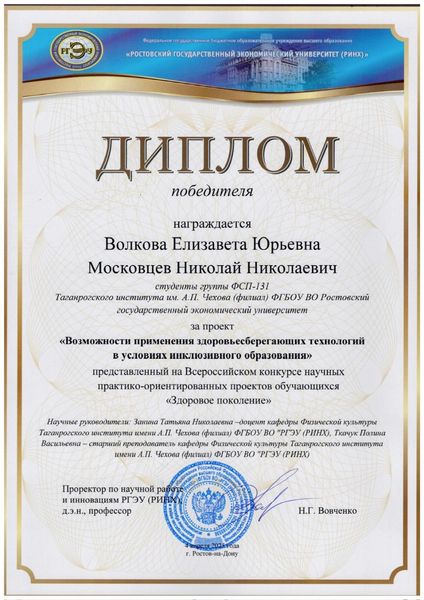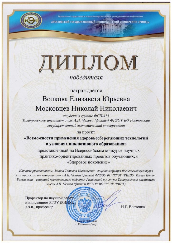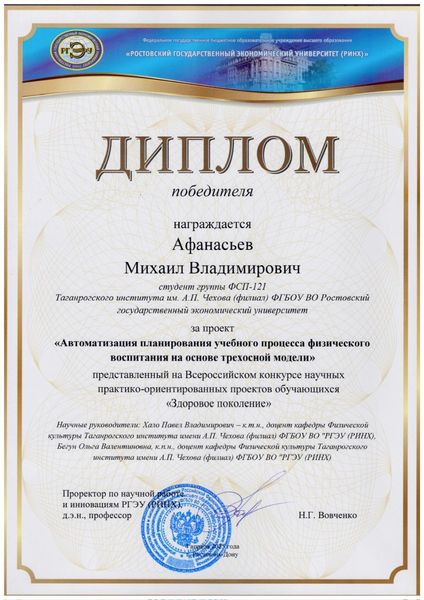 Новости все 22 апреля, 2025 Студенты факультета физики, математики, информатики профилей «Физическая культура» и «Дополнительное образование (спортивная подготовка)» стали победителями Всероссийского конкурса научных практико-ориентированных проектов обучающихся «Здоровое поколение», проводимых РГЭУ (РИНХ)18 апреля стали известны результаты финального этапа Всероссийского конкурса научных практико-ориентированных проектов обучающихся «Здоровое поколение», который проходил в смешанном формате 4 апреля 2025 года. Цель мероприятия, проводимого кафедрой физического воспитания, спорта и туризма факультета компьютерных технологий и информационной безопасности РГЭУ (РИНХ) – определение потенциала проектных технологий в области физической культуры и здоровьесбережения. Обобщение и обмен инновационным опытом проводился по трем направлениям: 1. Проекты и идеи, направленные на укрепление здоровья студенческой молодежи. 2. Проекты и идеи, направленные на применение IT технологий в сфере здоровьесбережения. 3. Проекты и идеи, направленные на развитие принципов инклюзии и их осуществления в здоровьесбережении. На конкурс было представлено 157 научно-исследовательских проектов, выполненных под научным руководством ППС ведущих вузов России. Все работы на отборочном этапе прошли экспертную оценку. К участию в финальном этапе экспертной комиссией было допущено 10 проектов. Студентами Таганрогского института имени А. П. Чехова (филиала) РГЭУ (РИНХ) профилей «Физическая культура» и «Дополнительное образование (спортивная подготовка)» было подано два проекта, которые завоевали право быть представленными в финале. Это были проекты студентов Волковой Елизаветы Юрьевны (ФФМИ, ФСП-131) и Московцева Николая Николаевича (ФФМИ, ФСП-131). Тема проекта «Возможности применения здоровьесберегающих технологий в условиях инклюзивного образования». Научные руководители – доцент кафедры физической культуры Занина Татьяна Николаевна и старший преподаватель кафедры физической культуры Ткачук Полина Васильевна. Также был представлен проект Афанасьева Михаила Владимировича (ФФМИ, ФСП-121). Тема проекта «Автоматизация планирования учебного процесса физического воспитания на основе трехосной модели». Научные руководители – доценты кафедры физической культуры Хало Павел Владимирович и Бегун Ольга Валентиновна. Студенты достойно представили свои проекты, что позволило им победить в своих направлениях.