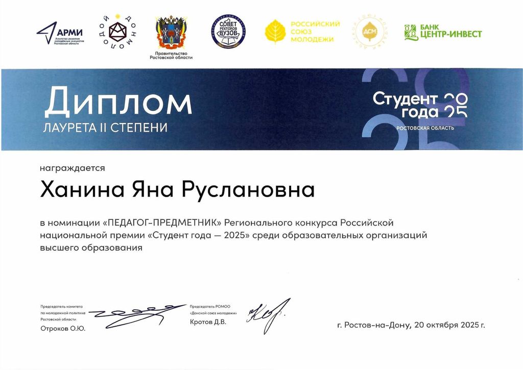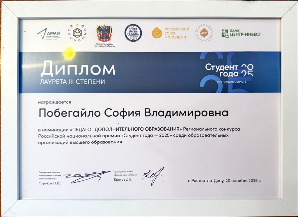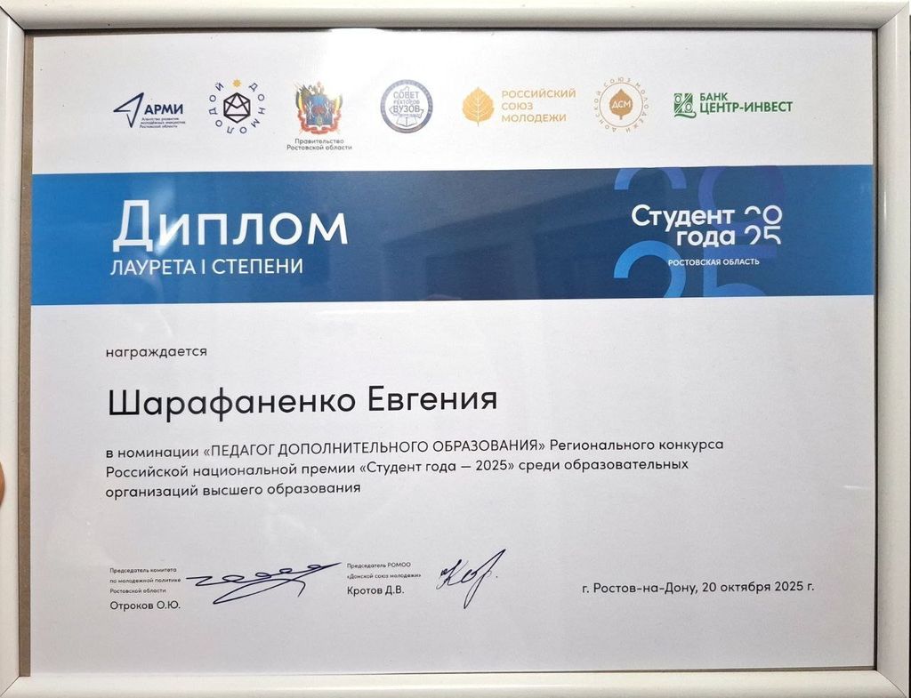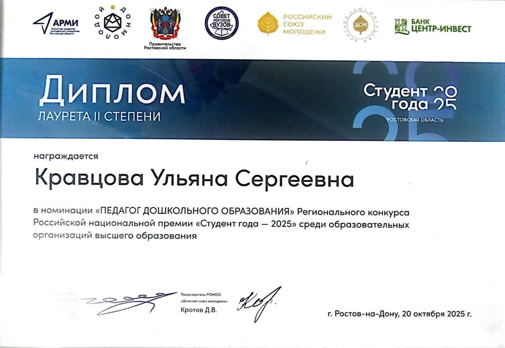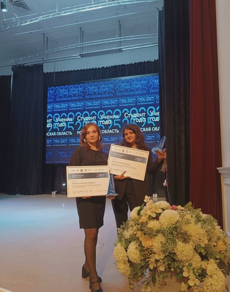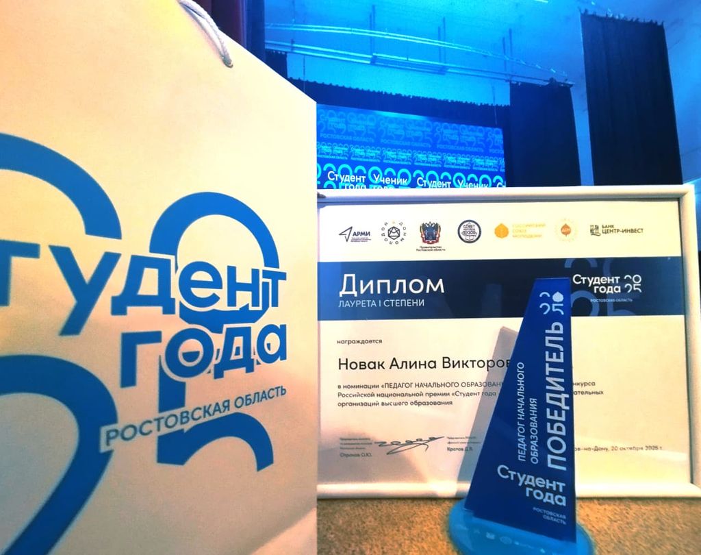 Новости все 22 октября, 2025 Студенты Таганрогского института имени А.П. Чехова (филиала) РГЭУ (РИНХ) – победители регионального конкурса «Студент года-2025»21 октября 2025 года состоялось торжественное награждение победителей регионального этапа конкурса «Студент года-2025» в городе Ростове-на-Дону. Мероприятие состоялось на площадке РГЭУ (РИНХ). Региональный конкурс «Студент года - 2025» проводится Комитетом по молодежной политике Ростовской области, профильными министерствами по направлениям номинаций Конкурса, Советом ректоров вузов Ростовской области, Ростовской областной молодежной общественной организацией «Донской союз молодежи» и государственным автономным учреждением Ростовской области «Агентство развития молодежных инициатив» в соответствии с государственной программой Ростовской области «Молодежная политика и социальная активность». Цель конкурса - выявление и поддержка обучающихся образовательных организаций высшего образования и среднего профессионального образования на территории Ростовской области, имеющих особые достижения в области профессиональной деятельности, творчества, спорта, молодежной политики, студенческого лидерства, общественной деятельности и добровольчества. Победители регионального этапа конкурса «Студент года-2025» из числа обучающихся Таганрогского института имени А.П. Чехова (филиала) РГЭУ (РИНХ): Номинация «Педагог начального образования»: 1 место - Новак Алина Викторовна, студентка группы НДО-451 факультета педагогики и методики дошкольного, начального и дополнительного образования; Номинация «Педагог дошкольного образования»: 1 место - Клышко Лидия Дмитриевна, студентка группы НДО-451 факультета педагогики и методики дошкольного, начального и дополнительного образования; 2 место - Кравцова Ульяна Сергеевна, студентка группы НДО-451 факультета педагогики и методики дошкольного, начального и дополнительного образования. Номинация «Педагог дополнительного образования»: 1 место - Шарафаненко Евгения Александровна, студентка группы МДОП-441 факультета педагогики и методики дошкольного, начального и дополнительного образования; 3 место - Побегайло Софья Владимировна, студентка группы МДОП-441 факультета педагогики и методики дошкольного, начального и дополнительного образования. Номинация «Педагог-предметник»: 1 место - Айрапетян Альбина Аветиковна, студентка группы ИЯ-352 факультета иностранных языков; 2 место - Ханина Яна Руслановна, магистрант группы ИНФG-111 факультета физики, математики, информатики. Поддержать лучших из лучших, победителей регионального конкурса «Студент года-2025», приехала директор Таганрогского института имени А.П. Чехова (филиала) РГЭУ (РИНХ) Светлана Анатольевна Петрушенко. Светлана Анатольевна лично поздравила лауреатов и отметила, что подобные конкурсы не просто выявляют талантливую молодежь, но и создают мощный стимул для раскрытия потенциала каждого студента, вдохновляя на новые свершения. Светлана Анатольевна выразила уверенность, что победа в этом престижном состязании станет для ребят отправной точкой для дальнейшего профессионального и личностного роста, а приобретенный опыт и признание помогут им смело идти к поставленным целям и добиться успеха во Всероссийском этапе конкурса «Студент года-2025» в городе Москва! |
