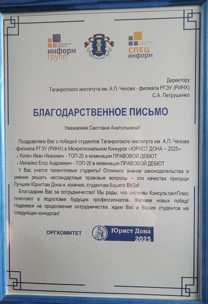Новости все 22 декабря, 2025 Победа студента направления подготовки «Юриспруденция» в межрегиональном конкурсе «Юрист Дона – 2025»Иван Копач, студент 3 курса направления подготовки «Юриспруденция», одержал победу в межрегиональном конкурсе «Юрист Дона – 2025» ТОП-20 в номинации «Правовой дебют». Научным руководителем выступила заведующий кафедрой отраслевых юридических дисциплин, канд. юрид. наук, доцент О.А. Курилкина. 18 декабря на тожественном мероприятии, посвященном вручению ежегодной премии «Юрист года» и подведению итогов областного конкурса «Юрист Дона – 2025», И.И. Копач был награжден дипломом, а директор Таганрогского института имени А.П. Чехова (филиал) «РГЭУ (РИНХ)» С.А. Петрушенко получила благодарственное письмо. Поздравляем И.И. Копач с победой и желаем дальнейших профессиональных свершений! |