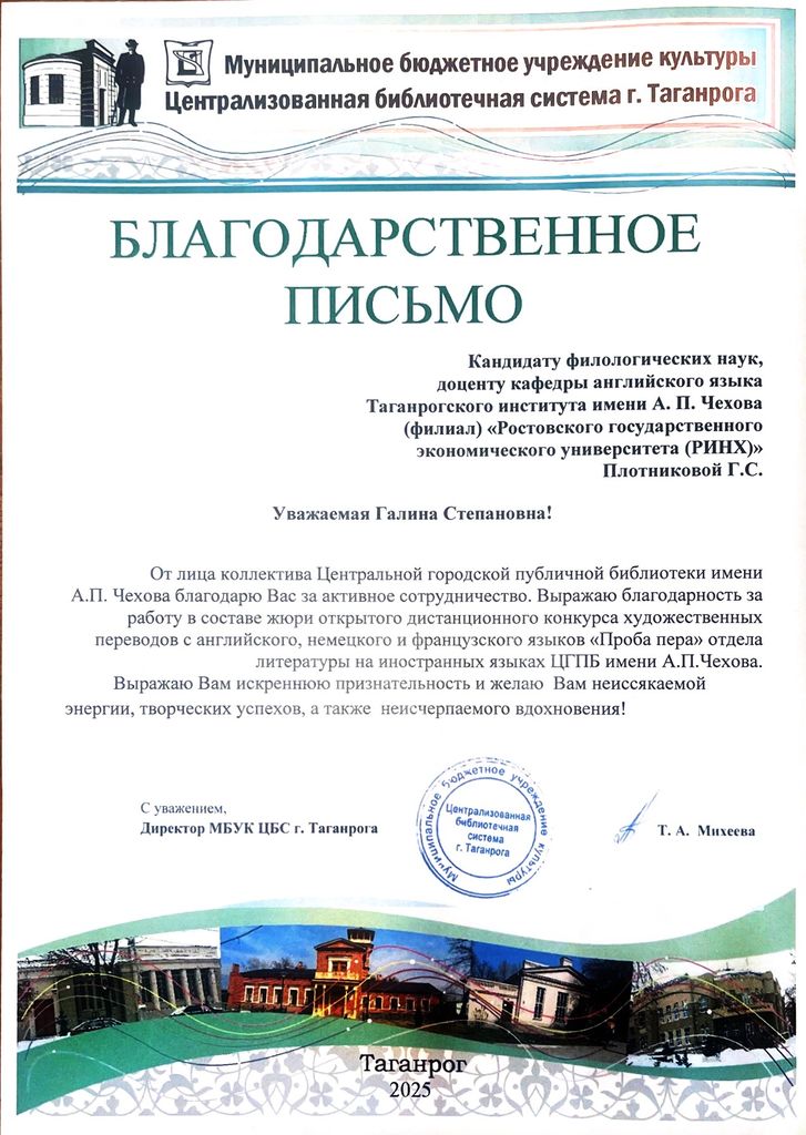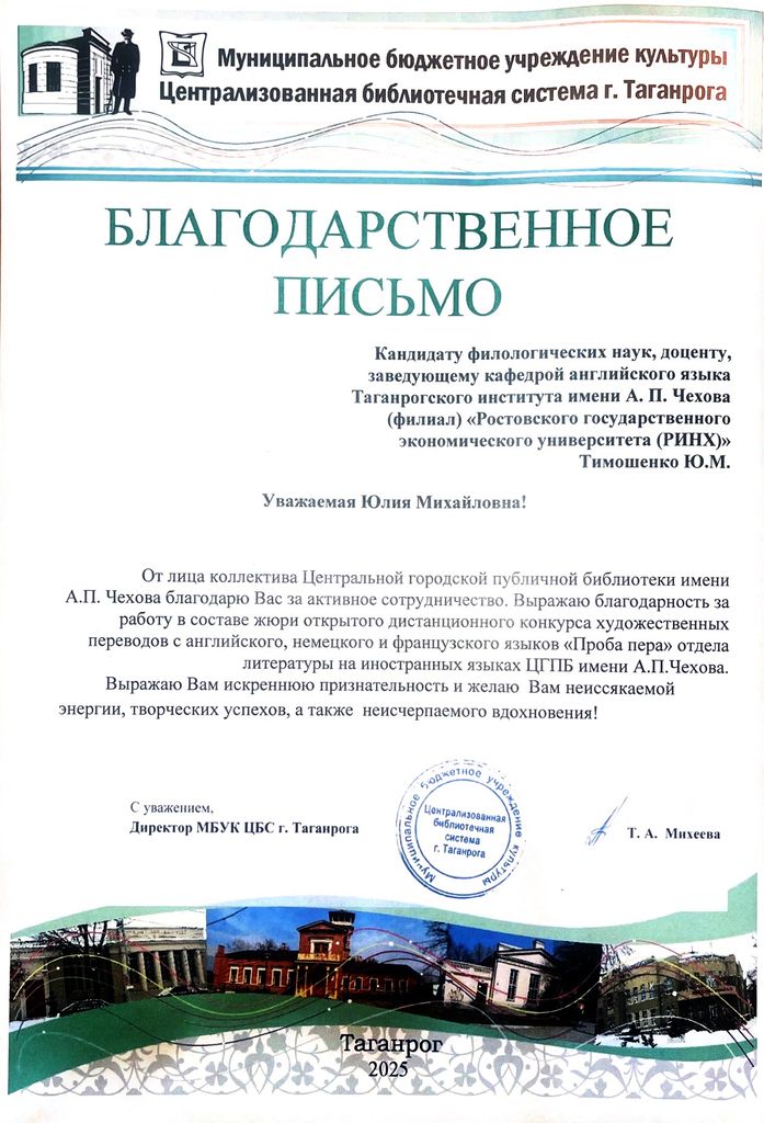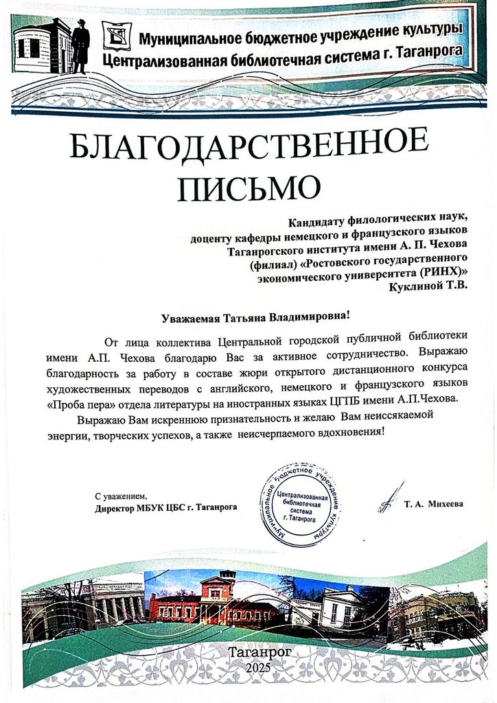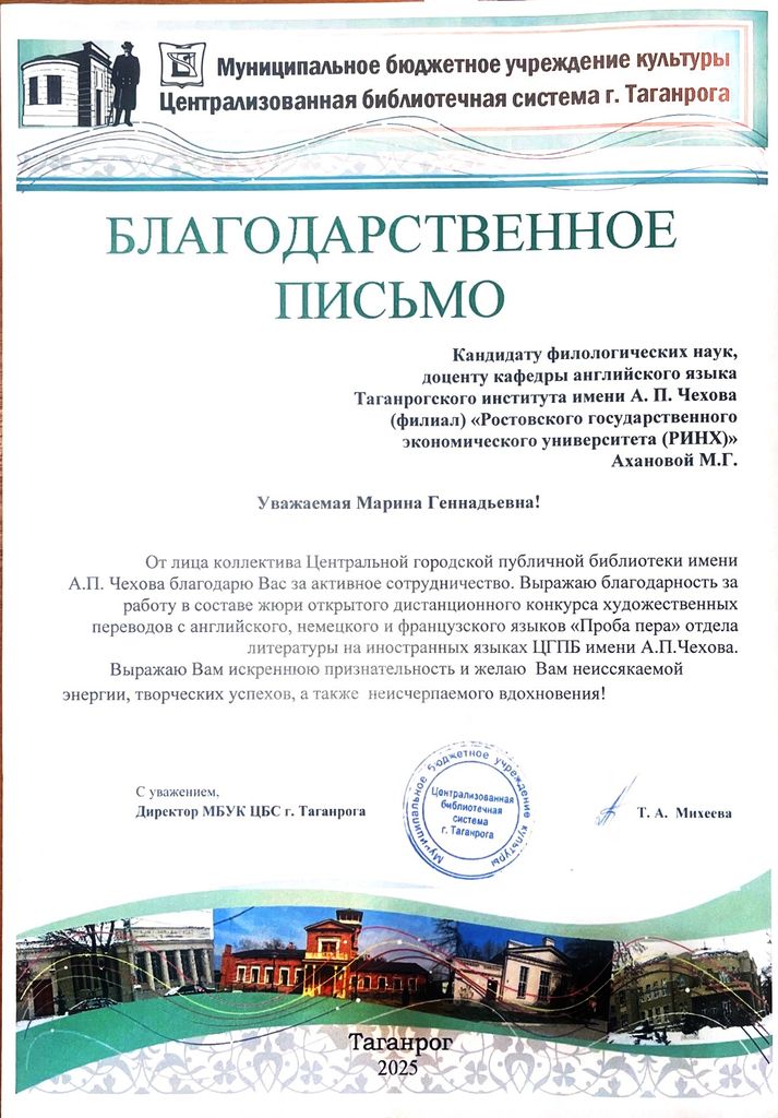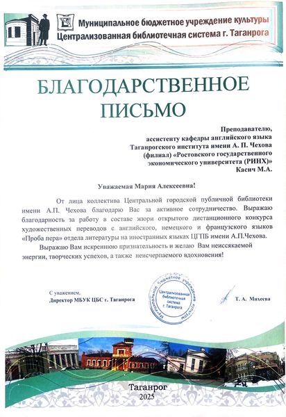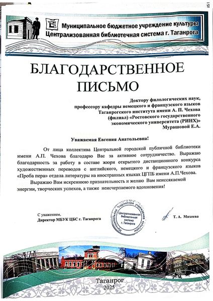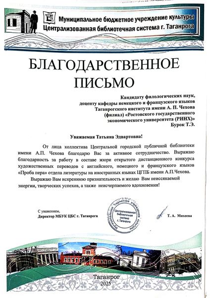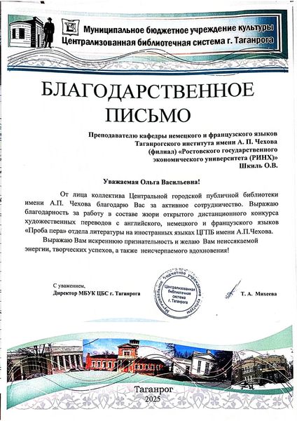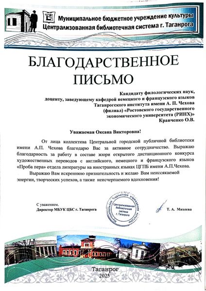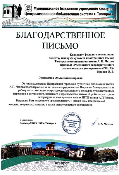 Новости все 22 декабря, 2025 Преподаватели факультета иностранных языков - эксперты III Всероссийского конкурса художественных переводов «Проба пера»Преподаватели кафедры английского языка и кафедры немецкого и французского языков приняли активное участие в работе жюри III Всероссийского дистанционного конкурса художественных переводов на английском, французском и немецком языках для школьников «Проба пера». Заведующая кафедрой английского языка Тимошенко Ю. М., декан факультета иностранных языков Кравец О.В., зав. кафедрой немецкого и французского языков Кравченко О.В., преподаватели и доценты кафедры английского языка Аханова М.Г., Касич М.А., Полякова Е.В., Дебердеева Е.Е., Савицкая А.Н., Кликушина Т.Г., Пальмова Е.А., Щитова Н.Г., Плотникова Г.С. , а также преподаватели кафедры немецкого и французского языков Мурашова Е.А, Куклина Т.В., Шкиль О.В. , Кравченко О.В., Бурок Т.Э. проверили и оценили более восьмидесяти конкурсных работ на английском языке, 42 работы на немецком, а также 15 работ на французском языке. Конкурс собрал участников из разных регионов России: Саратова, Орловской области, Калининградской области, Республики Бурятия, Нижнего Новгорода и Москвы. Это подчеркивает масштаб мероприятия и заинтересованность школьников всей страны в изучении иностранных языков и литератур. Цель конкурса заключается в приобщении школьников к ценностям мировой литературы посредством библиотечных ресурсов, развитии коммуникативных и аналитических способностей учащихся, формировании художественного вкуса и читательской культуры, воспитании гуманистических и культурных ценностей, направленных на повышение социокультурного уровня современного общества, повышении мотивации к изучению иноязычных культур. По словам М.Шагинян: «Знание многих иностранных языков помогает понять силу и красоту, особенности и своеобразие собственного родного языка». Организаторами конкурса выступили Отдел литературы на иностранных языках Центральной городской публичной библиотеки имени А.П. Чехова и Управление образования города Таганрог. Работа членов жюри показала высокий уровень ответственности и профессионализма, способствовала развитию творческих способностей школьников и поддержала интерес к иностранным языкам и литературе среди молодежи. |