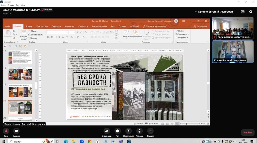 Новости все 23 апреля, 2025 IV Теоретико-прикладная школа молодого лектора «Преступления нацистов не имеют срока давности»На факультете истории и филологии с 7 апреля по 21 апреля прошла IV Теоретико-прикладная школа молодого лектора «Преступления нацистов не имеют срока давности» под эгидой регионального отделения Российского общества «Знание» в Ростовской области. На открытие школы с приветственными словами к участникам школы обратилась директор филиала Российского общества «Знание» в Ростовской области, канд. ист. наук Ж.С. Метелкина. Проектное задание по подготовке итогового продукта школы в формате лекции для школьников члены команд получили от декана факультета истории и филологии, члена Общественного Совета Ростовского регионального отделения Российского общества «Знание», лектора Российского общества «Знание» канд. ист. наук В.А. Агеевой. В программу школы вошли следующие мероприятия: · Лекция декана факультета истории и филологии, кандидата исторических наук В.А. Агеевой «Преступлениянемецко-фашистских оккупантов и их пособников на территории г. Таганрога в 1941-1943 гг.: источники, события, память»; ·Лекция директора МОБУ СОШ № 20 г. Таганрога, кандидата филологических наук Е.В. Шутовой о роли исторических книг в ознакомлении с явлением Холокоста. Лектор подробно остановилась на книге Льва Гинзбурга «Бездна», в которой повествуется о страшной трагедии – фашистской оккупации Юга России. Автор рассказывает о судебном процессе 1962 по 1965 г над пособниками фашистов, участниками зондеркоманд. Е.В. Шутова также подняла актуальные вопросы ответственности каждого, кто стоит на службе преступных режимов, кто совершает бесчеловечные поступки. А кроме того, напомнила, что это наша боль, о которой мы не вправе забыть; ·Лекция доцента РГГУ, канд. филос. наук Светланы Анатольевны Тиханкиной «Уроки Холокоста: нужны ли они сегодня?» руководитель образовательных программ Центра «Холокост» (г. Москва); · Лекция «Какой должна быть школьная лекция?» На этот вопрос ответила канд. пед. наук, заместитель декана факультета истории и филологии по УР Ольга Николаевна Кирюшина; · Лекция канд. филол. наук, доцента кафедры русского языка и литературы Софьи Владимировны Смоличевой «Женщина и война в истории и искусстве»; · Методическая мастерская – ценные практические советы участники школы получили от учителя истории и обществознания школы № 20 г. Таганрога, доцента кафедры истории, канд. филос. наук Ирины Владимировны Наливайченко. · Лекция директора Государственного архива Ростовской области, лектор Российского общества «Знание», эксперта федерального проекта «Без срока давности» и одного из авторов археографического предисловия к сборнику документов проекта, посвящённого Ростовской области, канд. ист. наук Н. А. Трапша, в которой он обобщил и раскрыл основные задачи проекта «Без срока давности» на современном этапе, в том числе, с использованием инструментария архивиста и историка; · Лекция руководителя Научно-образовательного центра устной истории Воронежского института высоких технологий, автора учебной онлайн-платформы «Обучение на основе интервью. Принудительный труд 1939-1945 гг.» канд. ист. наук Н.П. Тимофеевой «"Восточные рабочие" в промышленности нацисткой Германия: история и память»; · Заместитель директора Таганрогского инст