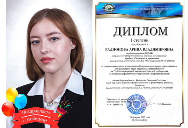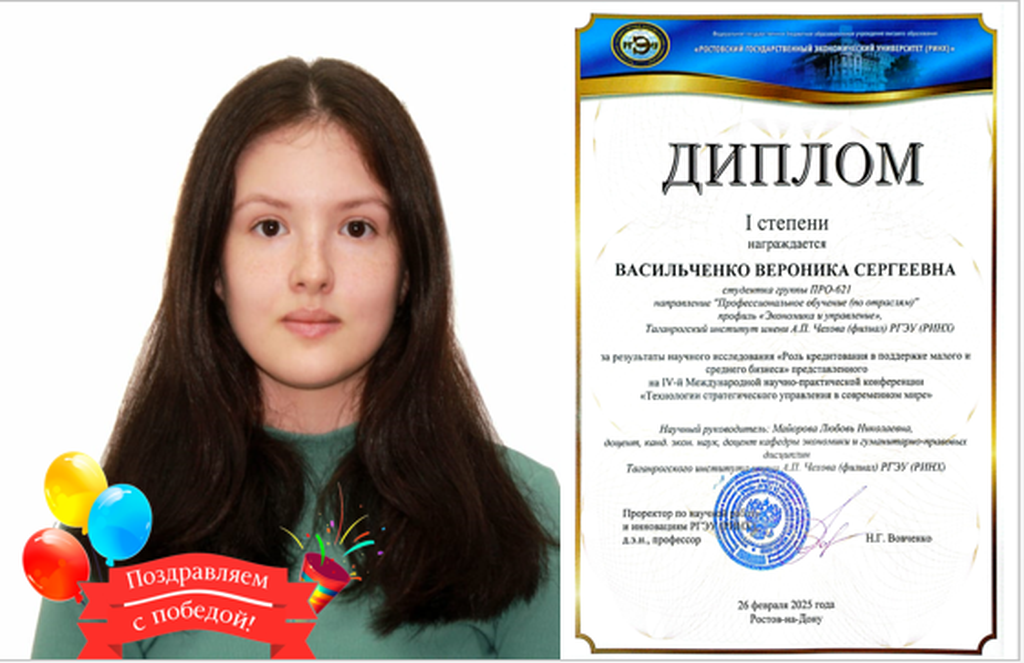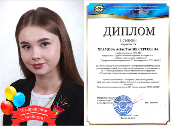 Новости все 23 апреля, 2025 Студенты факультета экономики и права – победители IV Международной научно-практической конференции «Технологии стратегического управления в современном мире: вызовы и возможности»Поздравляем студентов 2 и 3 курсов факультета экономики и права В.С. Васильченко (гр. ПРО-621), А.В. Радионову (гр. ПРО-631) и А.С. Храмову (гр. ПРО-631) с успешным выступлением на IV Международной научно-практической конференции «Технологии стратегического управления в современном мире: вызовы и возможности». Международная научно-практическая конференция «Технологии стратегического управления в современном мире» проходила 26 и 27 февраля 2025 года в онлайн- и офлайн-форматах. В дебатах и представлении результатов научных исследований приняли участие преподаватели, аспиранты, магистранты и студенты университетов и научно-исследовательских институтов Республик Беларусь, Армения, Таджикистан, Афганистан, Болгарской Республики, а также российских и зарубежных вузов городов Ростов-на-Дону, Таганрог, Шахты, Москва, Бургас, София. Студенты факультета экономики и права представили свои научные исследования в секции «Предпринимательство: новые вызовы и возможности», модератором которой выступила к. эконом. н., доцент кафедры инновационного менеджмента и предпринимательства РГЭУ (РИНХ) Светлана Викторовна Грицунова. По итогам конференции доклады студентов факультета экономики и права отмечены следующим образом: Васильченко В.С. – диплом I степени. Научный руководитель – канд. экон. наук, доцент кафедры экономики и гуманитарно-правовых дисциплин Л.Н. Майорова. Радионова А.В. – диплом I степени. Научный руководитель – канд. пед. наук, доцент кафедры экономики и гуманитарно-правовых дисциплин С.С. Федорцова. Храмова А.С. – диплом I степени. Научный руководитель – канд. пед. наук, доцент кафедры экономики и гуманитарно-правовых дисциплин С.С. Федорцова. Поздравляем Веронику, Арину, Анастасию и их научных руководителей с яркими победами! Желаем дальнейших научных достижений! |