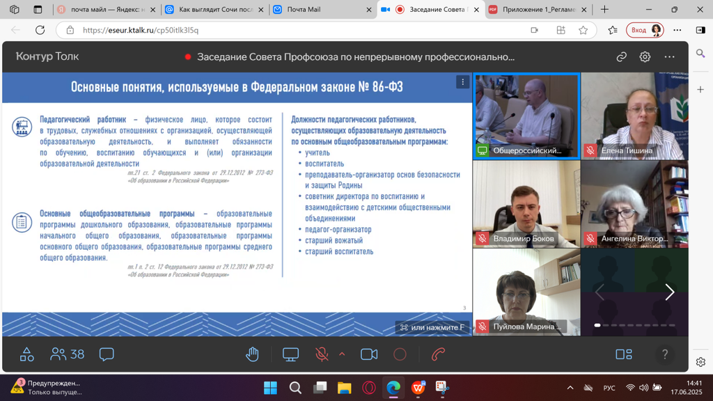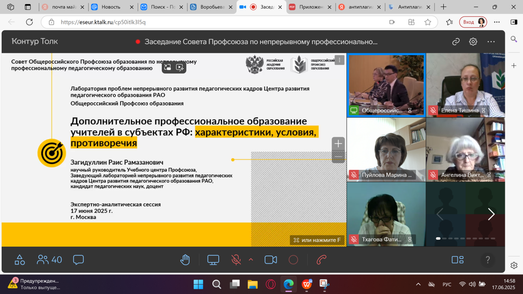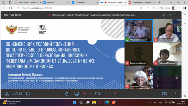 Новости все 23 июня, 2025 Участие директора Центра повышения квалификации Таганрогского института имени А.П. Чехова (филиал) РГЭУ (РИНХ) в экспертно-аналитической сессии РАО по обсуждению вопросов изменения условий получения дополнительного профессионального педагогического образования.20 июня директор ЦПК Пуйлова Марина Алексеевна приняла участие в работе экспертно-аналитической сессии, которая проводилась Лабораторией проблем непрерывного развития педагогических кадров Центра развития педагогического образования РАО. В рамках работы экспертно-аналитической сессии обсуждались вопросы изменения условий получения дополнительного профессионального педагогического образования, вносимых Федеральным законом от 21.04.2025 № 86-ФЗ; проблемы кадрового обеспечения реализации программ повышения квалификации педагогических работников в региональных организациях ДППО; содержательное обеспечение программ ДППО в государственных организациях ДППО и др. |