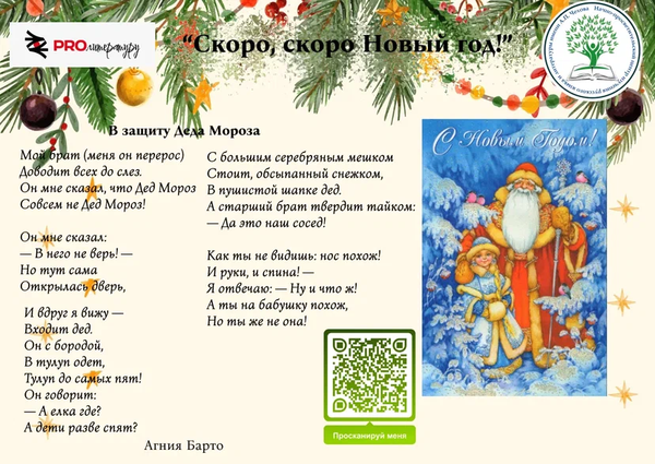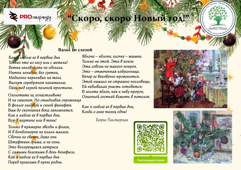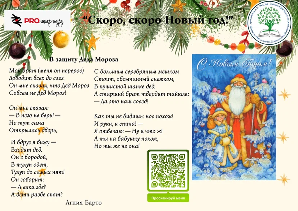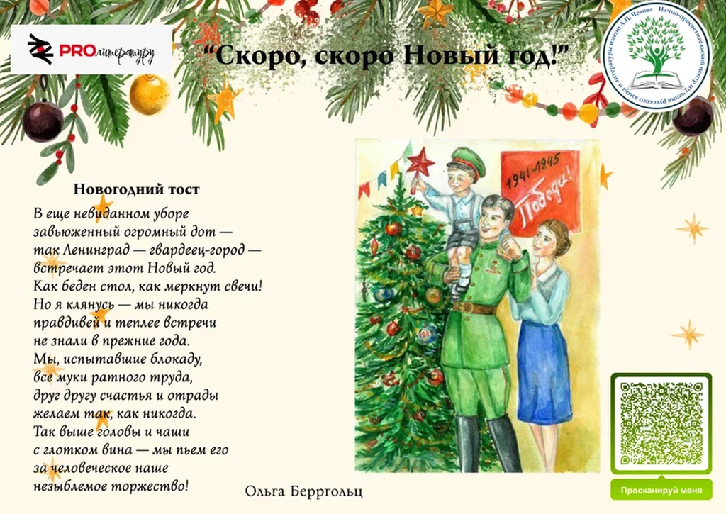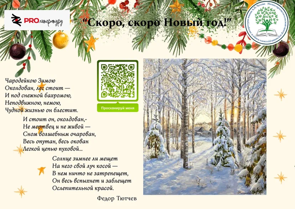 Новости все 23 декабря, 2025 Скоро, скоро Новый год!Кафедра русского языка и литературы, Научно-просветительский центр имени А.П.Чехова в рамках просветительско-образовательного проекта «ПРОлитературу» представляет декабрьский выпуск газеты «Скоро, скоро Новый год!» В зимнем выпуске газеты – стихотворения детской писательницы Агнии Барто. Перейдя по GR- коду, можно послушать стихи в исполнении самого автора. Ощущение сказочности происходящего подарит стихотворение Ф.Тютчева «Чародейкою Зимою», написанное им 31 декабря 1852 года: «Чародейкою Зимою околдован, лес стоит…» Вместе с хорошо знакомыми с детства строками И.Сурикова как будто придет сама зима: «Белый снег, пушистый в воздухе кружится и на землю тихо падает, ложится…». В выпуске философские строки А.Твардовского и жизнеутверждающие слова Ольги Берггольц, встречающей Новый год в блокадном Ленинграде: «За человеческое наше незыблемое торжество!» С новогодней газетой уже по традиции познакомятся и учителя и ученики лицея № 4. Магистрант кафедры русского языка и литературы Василенко Е.А., учитель 4 лицея, познакомила с содержанием новогодней газеты девятиклассников. Новогодняя газета подготовлена преподавателем кафедры русского языка и литературы Ким Н.М. и студенткой 5 курса факультета истории и филологии Сарма Кариной. Погрузитесь в мир новогодних предчувствий вместе с русской поэзией! С наступающим Новым годом! Весь выпуск газеты: https://disk.yandex.ru/d/KCHGg5McVnSDpg Проект «ПРОлитературу» в лицее № 4 (ТМОЛ): |