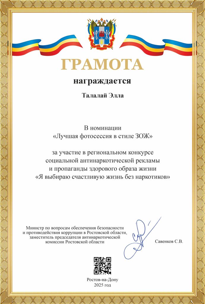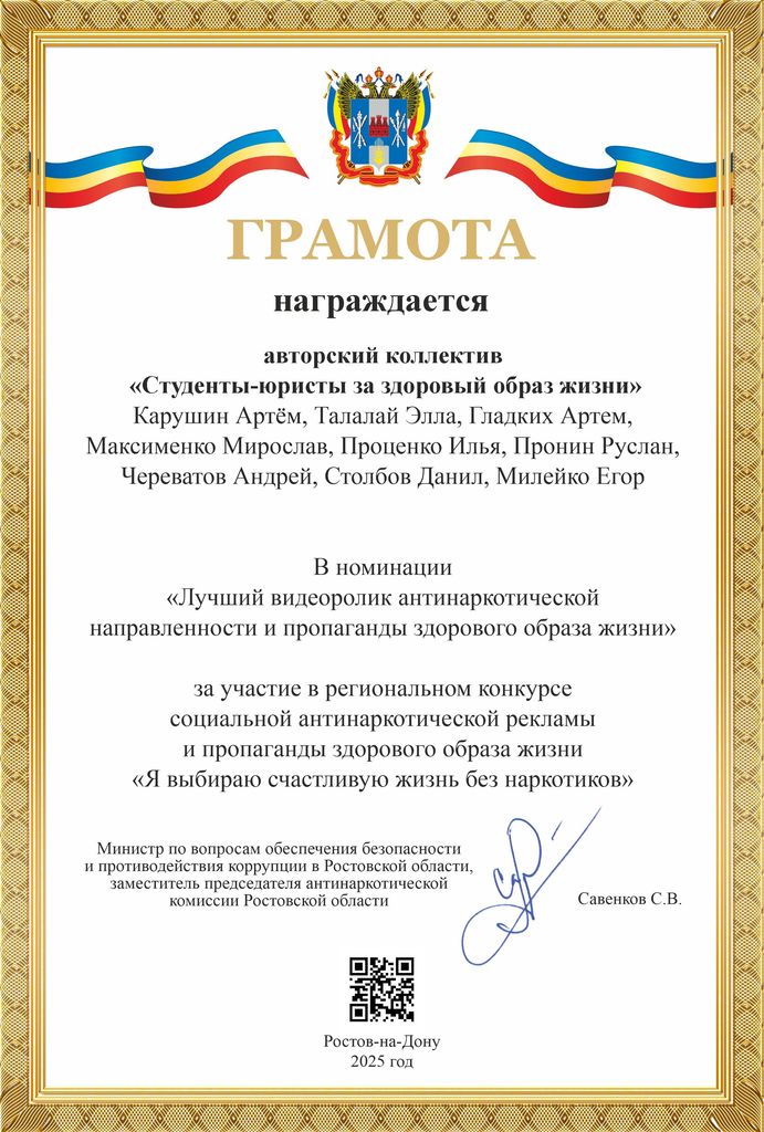 Подведены итоги регионального конкурса «Я Выбираю Счастливую Жизнь Без Наркотиков!»В декабре были подведены итоги и стали известны результаты ежегодного регионального конкурса социальной антинаркотической рекламы и пропаганды здорового образа жизни «Я выбираю счастливую жизнь без наркотиков!», в котором активное участие приняли студенты Таганрогского института имени А.П. Чехова, факультета экономики и права, направления подготовки «Юриспруденция», гр.ЮР-611 под руководством куратора В.А. Тимофеенко. Первокурсники совместно с куратором подготовили и отправили свои работы в нескольких номинациях: · «Лучший видеоролик антинаркотической направленности и пропаганды здорового образа жизни»; ·«Лучшая фотосессия в стиле ЗОЖ»; По итогам конкурса жюри наградило участников и руководителя В.А. Тимофеенко за подготовку команды грамотами. Поздравляем участников конкурса! |