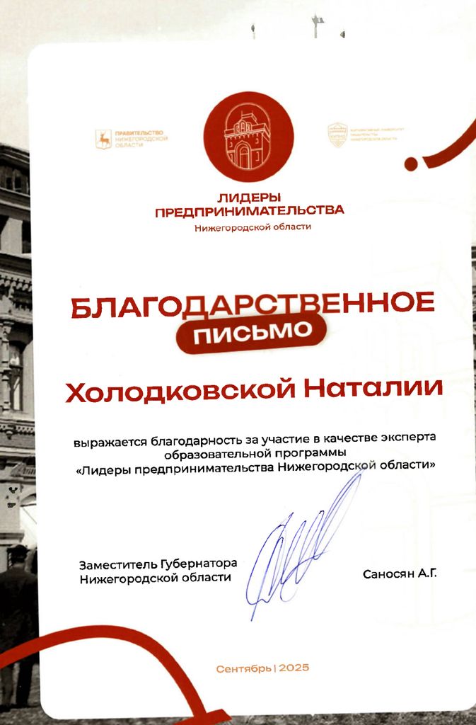 Новости все 24 сентября, 2025 Доцент Н.С. Холодковская – эксперт проекта «Лидеры предпринимательства»Доцент кафедры экономики и гуманитарно-правовых дисциплин Н.С. Холодковская приняла участие в качестве эксперта заочного тура оценки бизнес-проектов второго сезона образовательной программы «Лидеры предпринимательства» Нижегородской области. Второй сезон проекта – это: 4072 заявки на участие; 300 участников 100 финалистов, которые получили дипломы губернатора Нижегородской области и поддержку в реализации своих бизнес-инициатив; 20 победителей, получивших гранты в размере 500000 рублей на развитие своего дела. За работу в качестве эксперта образовательной программы «Лидеры предпринимательства» Н.С. Холодковская отмечена благодарственным письмом заместителя Губернатора Нижегородской области А.Г. Саносян. |