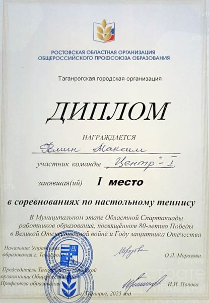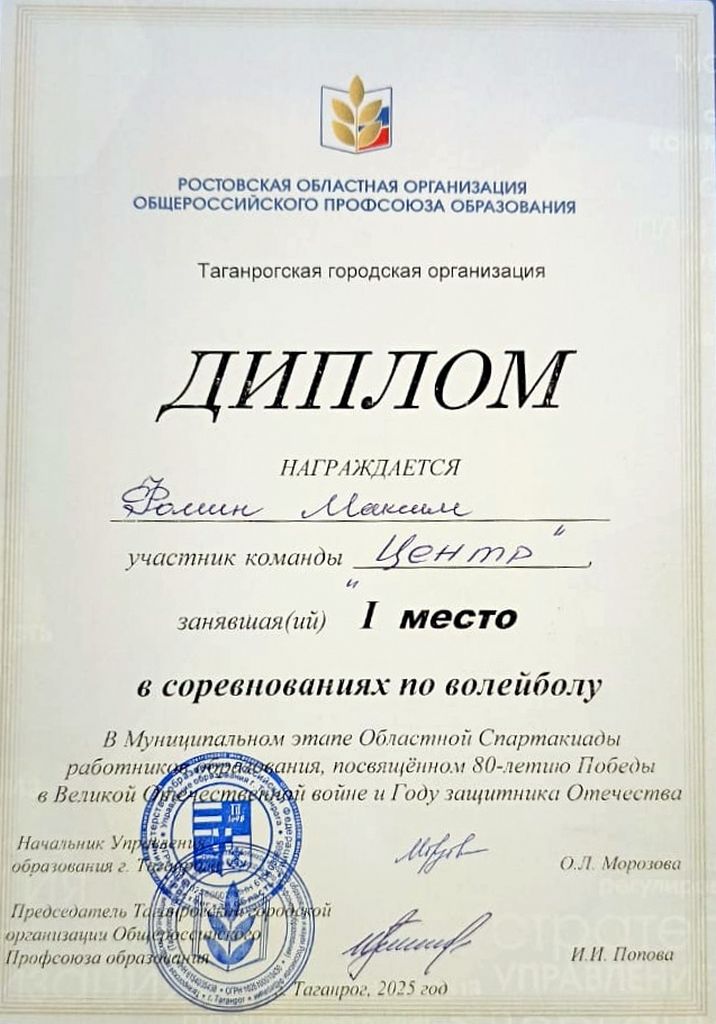 Новости все 24 октября, 2025 Студент факультета физики, математики, информатики Максим Фомин стал победителем в двух видах программы муниципального этапа областной Спартакиады среди работников образования17 октября в г. Таганроге прошел муниципальный этап областной Спартакиады работников образования, посвященный 80-летию Победы в Великой Отечественной войне и году защитника Отечества. Участником Спартакиады был и наш студент третьего курса факультета физики, математики, информатики профилей «Физическая культура» и «Дополнительное образование (спортивная подготовка)» Максим Фомин (ФФМИ, ФСП-131), который работает учителем физической культуры в МАОУ СОШ № 10 города Таганрога. В результате Максим завоевал 1 место в соревнованиях по настольному теннису среди мужчин, а также в составе сборной команды «Центр» занял 1 место по волейболу. ПОЗДРАВЛЯЕМ МАКСИМА И ЕГО КОМАНДУ С ДОСТОЙНЫМ РЕЗУЛЬТАТОМ! ЖЕЛАЕМ ПОБЕДИТЕЛЯМ КРЕПКОГО ЗДОРОВЬЯ, УСПЕХОВ В УЧЕБЕ, ПЕДАГОГИЧЕСКОЙ ДЕЯТЕЛЬНОСТИ И СПОРТЕ! |