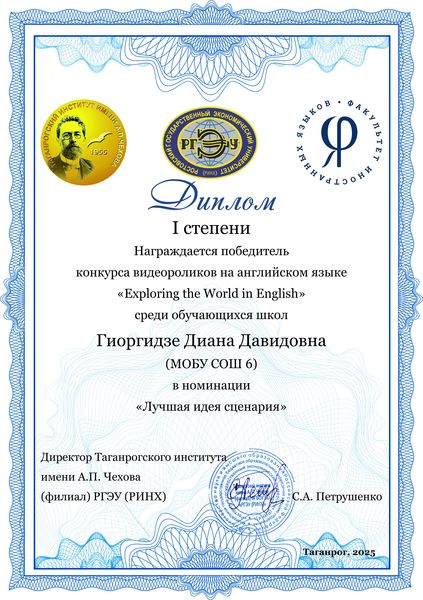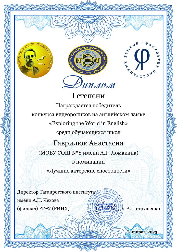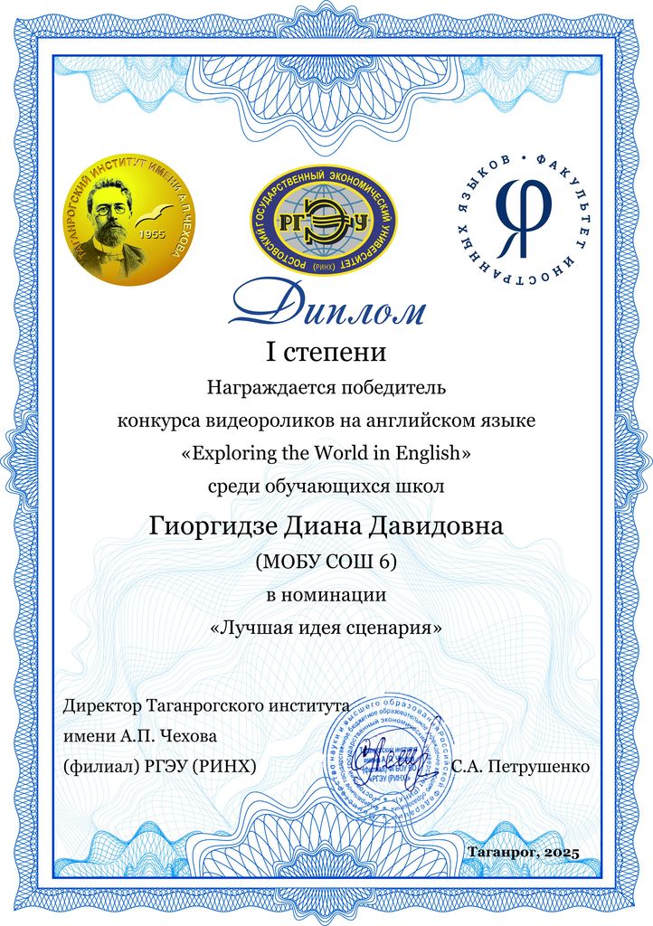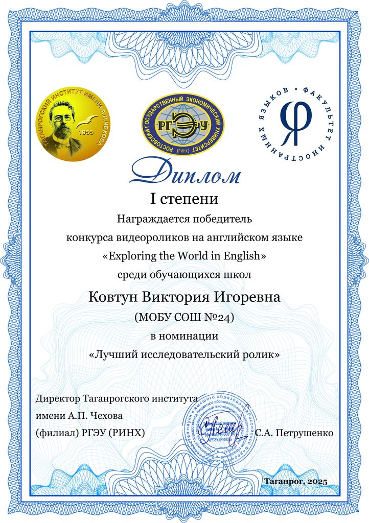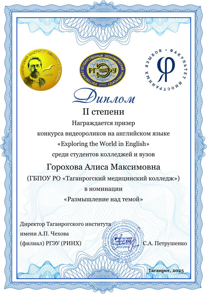 Новости все 24 декабря, 2025 Конкурс видеороликов на английском языке «Exploring the World in English» среди обучающихся старших классов (9-11), студентов колледжей и вузовС 20 ноября по 15 декабря кафедрой английского языка проводился конкурс видеороликов на английском языке «Exploring the World in English» среди обучающихся старших классов (9-11), студентов колледжей и вузов. Основными целями и задачами конкурса являлись профориентация обучающихся, воспитание патриотизма, повышение мотивации к изучению иностранного языка, создание условий для творческой самореализации участников конкурса. На конкурс было прислано 29 заявок от обучающихся школ, колледжей, техникумов и вузов г. Таганрога и Ростовской области: МАОУ гимназия имени А.П. Чехова, МОБУ СОШ № 3 имени Ю.А. Гагарина, МАОУ лицей № 4 (ТМОЛ), МОБУ СОШ № 8 имени А.Г. Ломакина, МОБУ СОШ № 6, МОБУ СОШ № 20, МОБУ СОШ №24, МОБУ СОШ № 31, МОБУ лицей № 33, МАОУ лицей № 28, МБОУ СОШ № 2 п. Орловский, МБОУ Краснодесантская СОШ, МБОУ Николаевская средняя школа, МБОУ Покровская средняя школа № 3, ГБОУ РО «Таганрогский медицинский колледж», Таганрогский техникум сервиса и жилищно-коммунального хозяйства, Таганрогский институт управления и экономики, Таганрогский институт имени А.П. Чехова. Тематика видеороликов была разнообразной и охватывала актуальные направления: «M y Native Town / Village», «Outstanding People of Russia», «Youth in Focus», «My Future Profession», «Crucial Environmental Problems of Today», «My Identity & Relationships». Присланные ролики оценивались жюри, в состав которого вошли декан факультета иностранных языков Ольга Владимировна Кравец, заведующий кафедрой английского языка Юлия Михайловна Тимошенко, доценты кафедры английского языка Галина Викторовна Михалева и Елена Андреевна Пальмова. Были учтены следующие критерии: - соответствие работы заявленной категории и раскрытие темы; - логичность, структурированность и ясность изложения материала; - лексико-грамматическое оформление речи (богатство лексики, грамматическая корректность); - произносительная сторона речи (четкость, фонетическая правильность); - креативность и оригинальность подачи материала; - техническое качество видеоролика (монтаж, звук, свет). Жюри отмечает высокое качество большинства присланных работ, их грамотную композицию, владение конкурсантами техникой монтажа, обработки звука, компьютерными программами. Каждый ролик был уникален, раскрывал внутренний мир авторов, демонстрировал их владение темой и личную эмоциональную вовлеченность в нее. Отдельно хочется отметить достаточно высокий уровень владения английским языком многих конкурсантов: корректность грамматического и стилевого оформления речи, богатство лексического запаса, сформированность фонетических навыков. Победители и призеры конкурса были определены в рамках следующих номинаций: «Лучшая идея сценария», «Лучшие актерские способности», «Самая интересная подача материала», «Лучший исследовательский ролик», «Приз зрительских симпатий», «Самый патриотический ролик», «Самое грамотное языковое и стилевое оформление ролика», «Самобытность стиля», «Размышление над темой», «Самое эмоциональное воздействие», «Специальный приз жюри». Организационный комитет конкурса искренне благодарит всех участников и их наставников – учителей и преподавателей английского языка за предоставленные видеоролики и надеется, что и сами участник