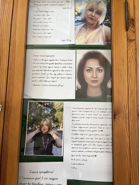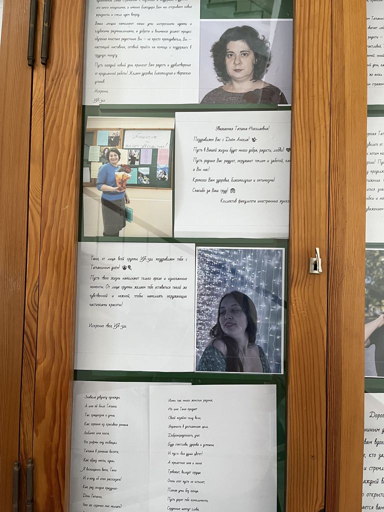 Новости все 27 января, 2025 Татьянин День на факультете иностранных языковС Днем Татьяны! Морозной зимою Пусть хватает любви и тепла, Света, радости – тоже с лихвою, Чтоб счастливой, Танюшка, была, Обожаемой, юной, любимой, Каждый день, каждый месяц и год, Пусть же ангел с тобою незримо Верным стражем по жизни идет! К 25 января, Татьяниному Дню и Дню студента, на факультете иностранных языков была организована фотовыставка с поздравлением милых Татьян с Днём Ангела. Коллектив факультета иностранных языков в лице преподавателей и студентов написали трогательные поздравления для очаровательных носительниц славного имени Татьяна. На фотовыставке были представлены авторские строки студентки группы ИЯ-341 Леухиной Ксении, а также поздравления от групп факультета любимым и уважаемым Татьянам! Знавала девушку однажды, А имя ей было Татьяна. Так грациозна и умна, Как героиня из красивого романа. Любимое имя поэта, Что рифмы ему посвящал. Татьяна в романах воспета, Как образ мечты, идеал. Я восхищаюсь вами, Тани И я хочу об этом рассказать! Как раз сегодня праздник- День Татьяны, Чего же скромно мне молчать? Среди зимы морозной и метелей буйных, Татьянин день приходит к нам. Его так ждем, ведь мы хотели Слова любви сказать сегодня вам. Имен так много женских разных, Но имя Таня придает Своей хозяйке силу воли, Упрямость в достижениях цели, Добропорядочность, учет. Будь счастлива, здорова и успешна, И пусть твоя душа цветет! А прелестное имя и ныне Тревожит, волнует сердца. Огонь этот пусть не остынет, Пленяя умы без конца. Пусть дарят тебе комплименты, Сердечные шепчут слова, И пусть от счастливых моментов Кружится твоя голова!