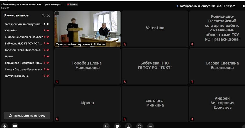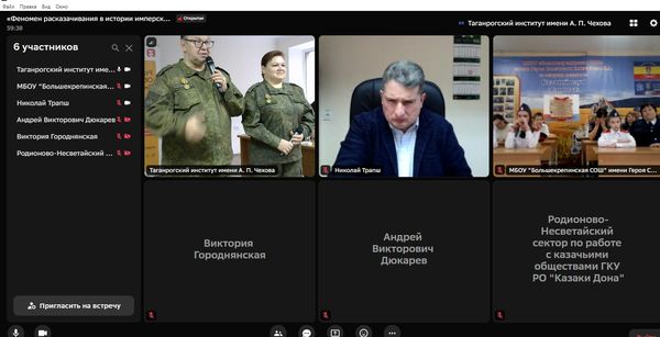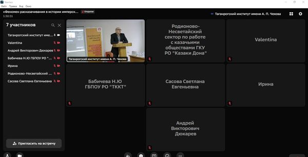 Новости все 28 января, 2025 Региональный круглый стол «Расказачивание в истории и памяти населения Юга России»На факультете истории и филологии состоялся региональный круглый стол «Расказачивание в истории и памяти населения Юга России». Мероприятие было приурочено к 24 января – Дню памяти жертв расказачивания. Соорганизаторами научной дискуссии стали Раздорский этнографический музей-заповедник, Государственный архив Ростовской области, Неклиновское юртовое казачье общество «Неклиновский юрт», Управление образования Администрации Неклиновского района, Ростовское региональное отделение Российского общества «Знание», МБОУ Большекрепинская СОШ им. Героя Советского Союза Пода П.А., Покровская средняя общеобразовательная школа «Неклиновский образовательный комплекс». Модератором круглого стола выступил заместитель директора по научной работе и проектной деятельности Таганрогского института имени А.П. Чехова (филиала) РГЭУ (РИНХ), председатель общественного совета при Департаменте по делам казачества и кадетских учебных заведений РО, руководитель научной лаборатории «Казачество в истории и памяти» факультета истории и филологии, руководитель магистерской программы «Историческое образование в системе казачьих кадетских учебных заведений», кандидат исторических наук, доцент Алексей Александрович Волвенко. Открыла дискуссионную площадку декан факультета истории и филологии, кандидат исторических наук, доцент В.А. Агеева. С приветственными словами к присутствующим обратились заместитель директора Таганрогского института имени А.П. Чехова (филиала) РГЭУ (РИНХ) по научной работе и проектной деятельности А.А. Волвенко, директор Раздорского этнографического музея-заповедника М.П. Мерзляков, директор Государственного архива Ростовской области, кандидат исторических наук, доцент Н.А. Трапш, первый заместителя (товарища) атамана «Неклиновского юрта» ТО ВКО «ВВД» А. В. Герасименко, директор МБОУ Покровская СОШ «НОК» Е. А. Тимошенко. В рамках круглого стола состоялись выступления со следующими докладами: · Основные тенденции в политике властей в отношении казачества в имперский период (XVIII – нач. XX вв.) – Волвенко Алексей Александрович, заместитель директора по научной работе и проектной деятельности Таганрогского института имени А.П. Чехова (филиала) РГЭУ (РИНХ), кандидат исторических наук, доцент; · Трансформация политики большевиков по отношению к донскому казачеству в 1919 году – Смирнов Виктор Алексеевич, ассистент кафедры истории Таганрогского института имени А.П. Чехова (филиала) РГЭУ (РИНХ), аспирант РГЭУ (РИНХ); · Расказачивание: альтернатива или угроза казачьему миру? – Дюкарев Андрей Викторович, доцент кафедры истории Таганрогского института имени А. П. Чехова (филиала) РГЭУ (РИНХ), кандидат исторических наук; · Политика расказачивания на примере Шахтинско-Донецкого округа – Мерзляков Михаил Петрович, директор Раздорского этнографического музея-заповедника; · Цимлянская плотина: последний аккорд расказачивания на Дону – Капканов Ефим Николаевич, ассистент кафедры истории Таганрогского института имени А.П. Чехова (филиала) РГЭУ (РИНХ), аспирант РГЭУ (РИНХ). В обсуждении вопросов круглого стола приняли участие заведующий кафедрой истории, кандидат исторических наук, доцент М.И. Гуров; преподаватели Таганро