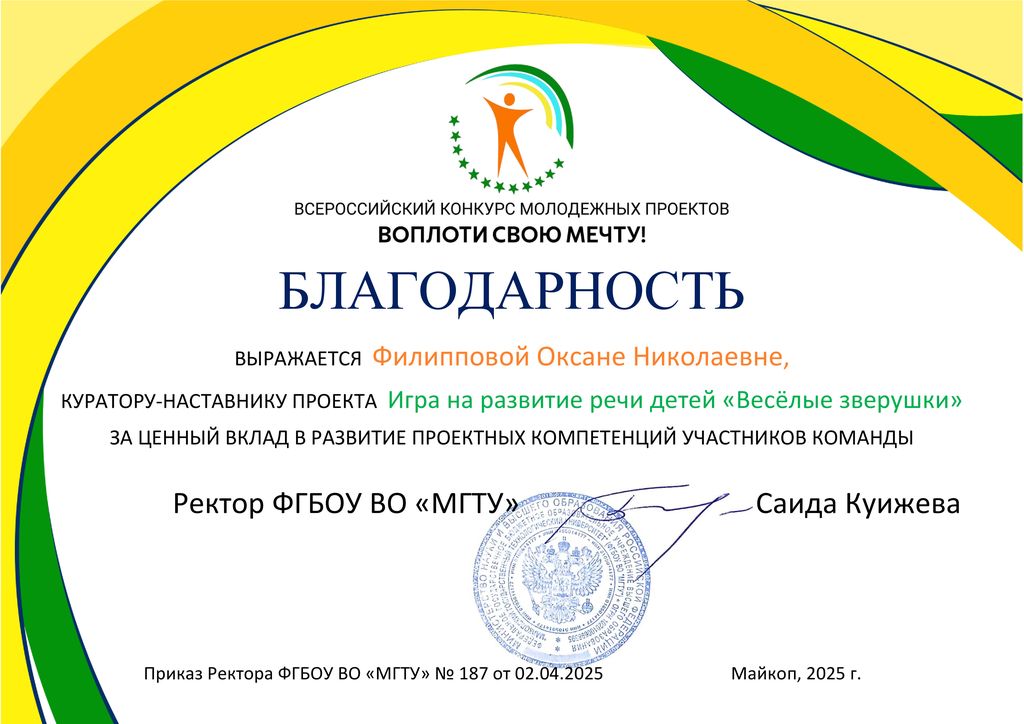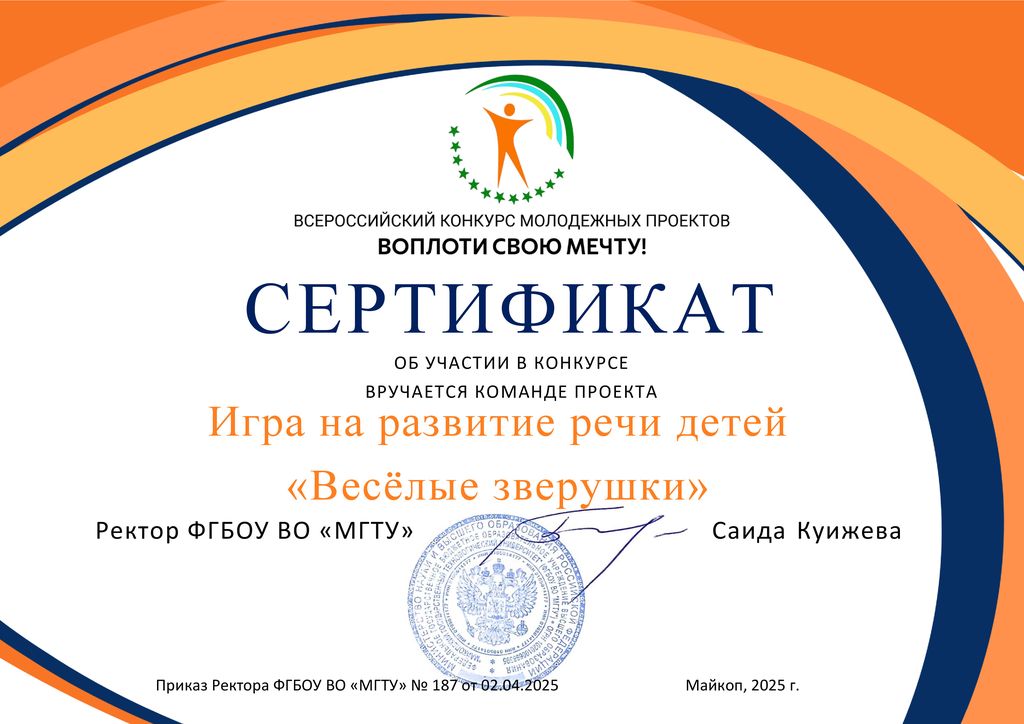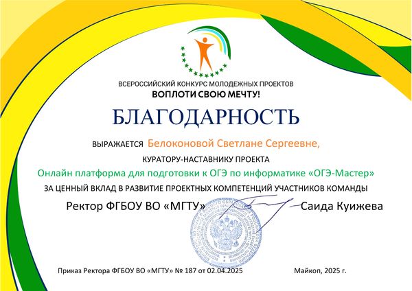 Новости все 28 мая, 2025 Итоги Всероссийского конкурса молодёжных проектов «Воплоти свою мечту!» (г. Майкоп)Студенты Таганрогского института имени А.П. Чехова (филиала) РГЭУ (РИНХ) приняли участие во Всероссийском конкурсе молодёжных проектов «Воплоти свою мечту!», который стартовал в декабре 2024 г. и завершился в мае 2025 г. На участие в сезоне 2025 года было подано 256 заявок из 29 регионов Российской Федерации: Белгородская область, Донецкая Народная Республика, Иркутская область, Краснодарский край, Красноярский край, Московская область, Нижегородская область, Новгородская область, Новосибирская область, Пензенская область, Пермский край, Республика Адыгея, Республика Башкортостан, Республика Бурятия, Республика Татарстан, Ростовская область, Самарская область, Саратовская область, Сахалинская область, Свердловская область, Ставропольский край, Тамбовская область, Тверская область, Тульская область, Тюменская область, Удмуртская Республика, Ульяновская область, Хабаровский край, Ярославская область. Таганрогский институт имени А.П. Чехова (филиал) РГЭУ (РИНХ) представили две команды: 1.Проект «Онлайн платформа для под готовки к ОГЭ по информатике «ОГЭ-Мастер» (номинация: «ИТ и цифровые технологии»). Состав команды: Полищук Марина Сергеевна, группа ПИ-141; Плотникова Марина Сергеевна, группа ИНФGZ-111; Шульженко Анастасия Александровна, группа ИНФGZ-111; Карпенко Александр Иванович, группа МИ-151; Ханина Яна Руслановна, группа МИ-151; Кучеренко Роман Александрович, группа ПИ-142; Кобзарь Екатерина Андреевна, группа МИ-151; Артемова Полина Руслановна, группа МИ-151; Перегуда Ирина Сергеевна, группа МИ-151; Нужнов Владимир Вадимович, группа МИ-151. Наставники – заведующий лабораторией цифровой трансформации образования и прикладной информатики, заместитель декана по учебной работе факультета физики, математики, информатики, кандидат технических наук, доцент Светлана Сергеевна Белоконова, заведующий кафедрой информатики, кандидат технических наук, доцент Ирина Анатольевна Тюшнякова. 2. Проект «Игра на развитие речи детей «Веселые зверушки»» (номинация: «Здоровье»). Состав команды: Бойченко Елена Сергеевна, группа ЛОГ-431; Скрипченко Светлана Артемовна, группа ЛОГ-431; Коваленко Ксения Николаевна, группа ЛОГ-431; Закатко Екатерина Сергеевна, группа ББЖ-451; Юдин Максим Сергеевич, группа ПРО-641. Наставник – начальник отдела организации и сопровождения научной деятельности, кандидат филологических наук, доцент Оксана Николаевна Филиппова. В образовательной части конкурса была проведена серия мастер-классов, вебинаров и встреч для знакомства участников конкурса со спецификой номинаций и более глубокого погружения в соответствующие сферы. Все мероприятия образовательной программы проводились экспертами федерального уровня, транслировались в группе конкурса «ВКонтакте». В течение нескольких месяцев студенты работали над своими проектами. В финал конкурса вышли 72 команды из 13 регионов России: Республика Адыгея, Удмуртская Республика, Самарская область, Республика Башкортостан, Пензенская область, Белгородская область, Краснодарский край, Ростовская область, Тверская область, Тамбовская область, Новгородская область, Сахалинская область, Тульская область. В число финалистов вошли и студенты Таганрогского института имени А.П. Чехова (филиала) РГЭУ 