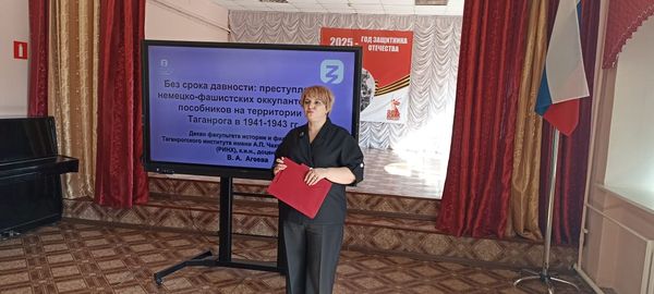 Новости все 29 апреля, 2025 Лекция «Без срока давности: преступления немецко-фашистских оккупантов и их пособников на территории г. Таганрога в 1941-1943 гг.» для обучающихся МОБУ СОШ №26Декан факультета истории и филологии Таганрогского института имени А. П. Чехова (филиала) РГЭУ (РИНХ), канд. ист. наук, доцент, лектор «Российского общества «Знание» прочитала лекцию «Без срока давности: преступления немецко-фашистских оккупантов и их пособников на территории г.Таганрога в 1941-1943 гг.», приуроченную к 19 апреля Дню единых действий в память о геноциде советского народа нацистами и их пособниками в годы Великой Отечественной войны 1941-1945 годов на площадке школы МОБУ СОШ № 26 г. Таганрога. В ходе лекции были представлены следующие факты: уничтожения больных из отделения для душевнобольных 5-й городской больницы, акция Холокоста; расстрелы мирных жителей и военнопленных на территории г. Таганрога и в Петрушинской «Балке смерти», угон на принудительные работы в Третий рейх. Лектор также обратила внимание на создание оккупантами в городе жизненных условий, рассчитанных на физическое уничтожение мирного населения. Особый эмоциональный накал аудитория испытала при обращении лектора к сюжету о трагедии детей таганрогских приютов, вывезенных нацистами из оккупированного города в украинское село Великая Лепетиха. Самому младшему из них было полтора года, а самой старшей девочке – 10 лет. Здесь с октября 1943 г. по февраль 1944 г. у них забирали кровь для офицеров Вермахта, лечившихся в плавучем немецком госпитале. В заключение В.А. Агеева отметила, что в судьбе г. Таганрога и его жителей наиболее страшной трагедией в годы Великой Отечественной войны стала немецко-фашистская оккупация, ставшая самой продолжительной на Юге России: она длилась с 17 октября 1941 г. по 30 августа 1943 г. |