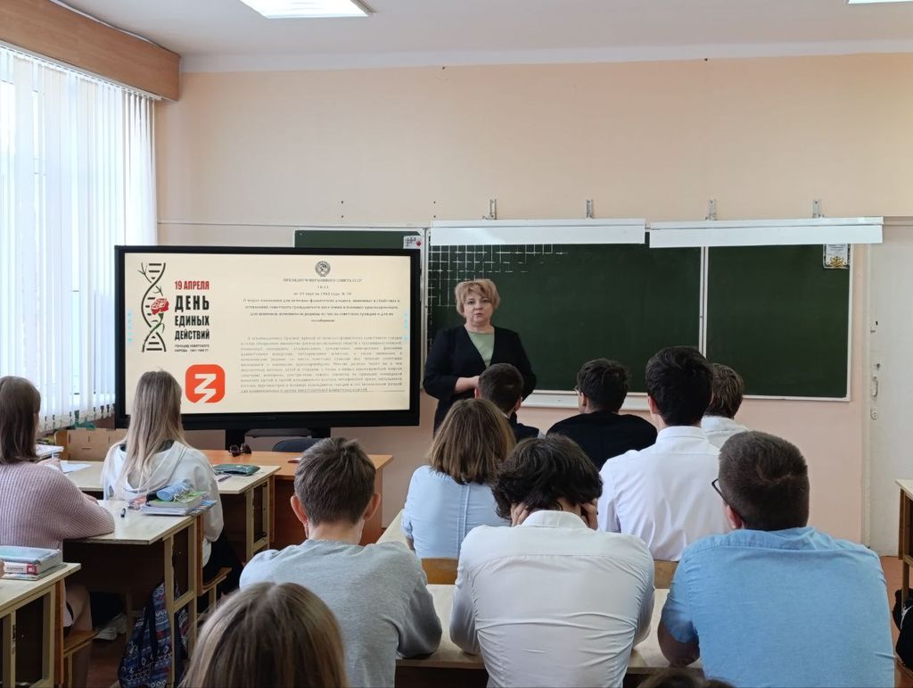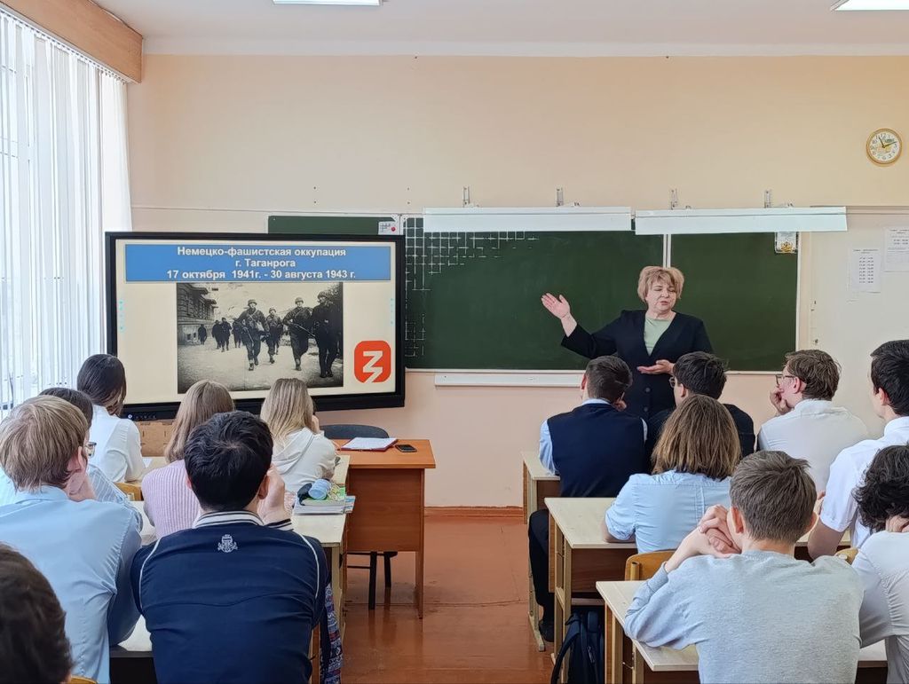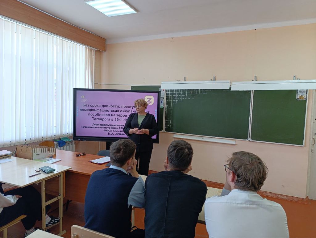 Новости все 29 апреля, 2025 Проект «Знание. Лекторий» на площадке МОБУ СОШ № 20 г. ТаганрогаДекан факультета истории и филологии Таганрогского института имени А. П. Чехова (филиала) РГЭУ (РИНХ), канд. ист. наук, доцент В. А. Агеева в рамках проекта «Российское общество «Знание» – «Знание.Лекторий» прочитала лекцию «Без срока давности: преступления немецко-фашистских оккупантов и их пособников на территории г.Таганрога в 1941-1943 гг.» для обучающиеся МОБУ СОШ № 20 г.Таганрога. Мероприятие поддержала директор школы, канд. филол. наук Е. В. Шутова. В содержание лекции нашло отражение правовое и историческое обоснование проведения 19 апреля Дня единых действий в память о геноциде советского народа нацистами и их пособниками в годы Великой Отечественной войны 1941-1945 годов. Лектор обратила внимание, что главной целью гитлеровцев в войне против советского государства было завоевание «жизненного пространства», которое им предстояло колонизировать и в значительной степени заселить людьми немецкой крови. Соответственно коренное население они собирались радикально сократить с помощью разных истребительных практик. В ходе лекции также были представлены следующие факты злодеяний немецко-фашистских оккупантов: уничтожения больных из отделения для душевнобольных 5-й городской больницы, акция Холокоста; расстрелы мирных жителей и военнопленных на территории г. Таганрога и в Петрушинской «Балке смерти», преступления против детства; угон на принудительные работы в Третий рейх, предумышленное создание в городе жизненных условий, рассчитанных на полное или частичное физическое уничтожение мирного населения. |