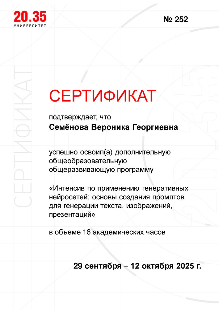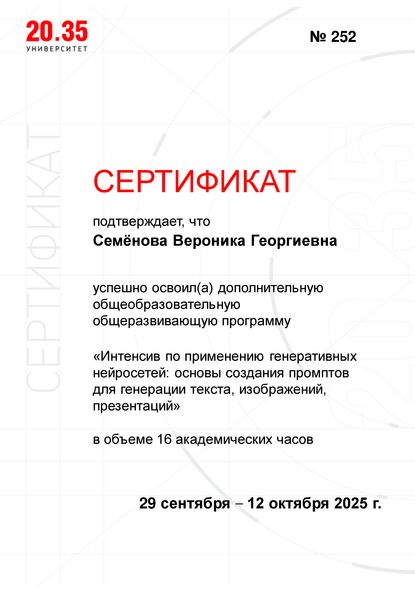Новости все 29 октября, 2025 Профессор кафедры русского языка, культуры и коррекции речи Вероника Георгиевна Семёнова приняла участие в интенсиве по применению генеративных нейросетейС 29 сентября по 12 октября в университете 20.35 состоялся осенний GPT-интенсив, посвященный знакомству с нейросетями, построению промптов для текстовых нейросетей, а также составлению промптов для самостоятельного анализа и исследования, в котором активное участие приняла профессор кафедры русского языка, культуры и коррекции речи Вероника Георгиевна Семёнова. Программа интенсива была насыщенной и включала составление структурированных промптов для решения задач с использованием нейросетей для генерации текста, создание промптов для проведения самостоятельных исследований по сбору источников, материалов, анализу информации, а также для генерации изображений с помощью нейросетей в разных стилях. Заключительный день интенсива был посвящен подготовке презентации посредством искусственного интеллекта и защите итогового проекта с помощью знаний, полученных на курсе. |