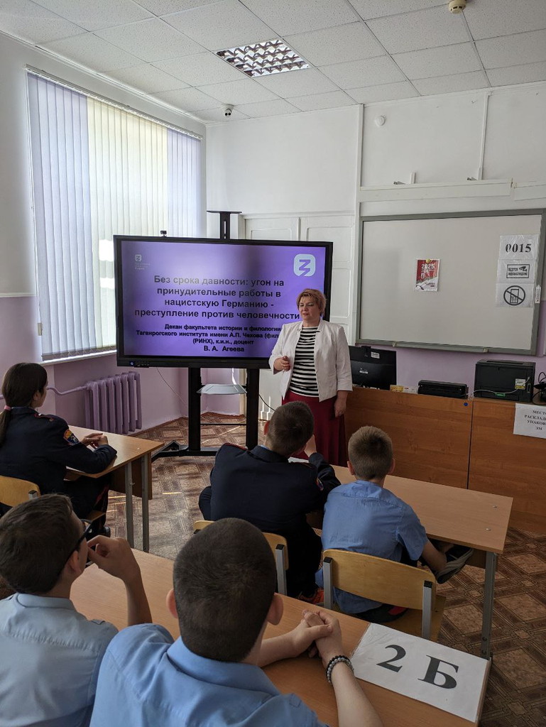 Новости все 30 мая, 2025 Публична лекция «Без срока давности: угон на принудительные работы в нацистскую Германию - преступление против человечности»Для обучающихся МОБУ СОШ № 26 г. Таганрога декан факультета истории и филологии, канд. ист. наук, доцент В. А. Агеева в рамках проекта «Российское общество «Знание» – «Знание. Лекторий» прочитала лекцию «Без срока давности: угон на принудительные работы в нацистскую Германию – преступление против человечности». В год 80-летия Победы в Великой Отечественной войны В.А. Агеева обратилась к теме геноцида советского народа и сохранения памяти о жертвах немецко-фашистских оккупантов и их пособников. Вниманию школьников была представлена также электронная база данных о жителях Ростовской области, угнанных немецко-фашистскими оккупантами в 1941 – 1943 гг. на принудительные работы в третий рейх, и интерактивная карта, содержащая статистические и пофамильные списки о трудоиспользовании жителей региона на территории нацистской Германии. Информация размещена в открытом доступе и позволяет найти сведения о родных, переживших военное лихолетье.