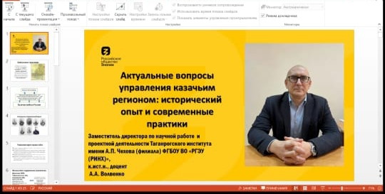 Новости все 30 мая, 2025 Участие кандидата исторических наук А. А. Волвенко в мероприятиях Института социологии и регионоведения Южного федерального университетаЗаместитель директора по научной работе и проектной деятельности ТИ имени А.П. Чехова (филиала) РГЭУ (РИНХ), председатель общественного совета при Департаменте по делам казачества и кадетских учебных заведений РО, руководитель научной лаборатории «Казачество в истории и памяти» факультета истории и филологии, руководитель магистерской программы «Историческое образование в системе казачьих кадетских учебных заведений», кандидат исторических наук, доцент Алексей Александрович Волвенко прочитал лекцию «Актуальные вопросы управления казачьим регионом: исторический опыт и современные практики» в рамках курсов повышения квалификации по программе «Регулирование межрелигиозных и межэтнических отношений в Ростовской области» Института социологии и регионоведения Южного федерального университета.