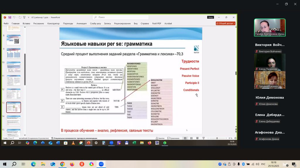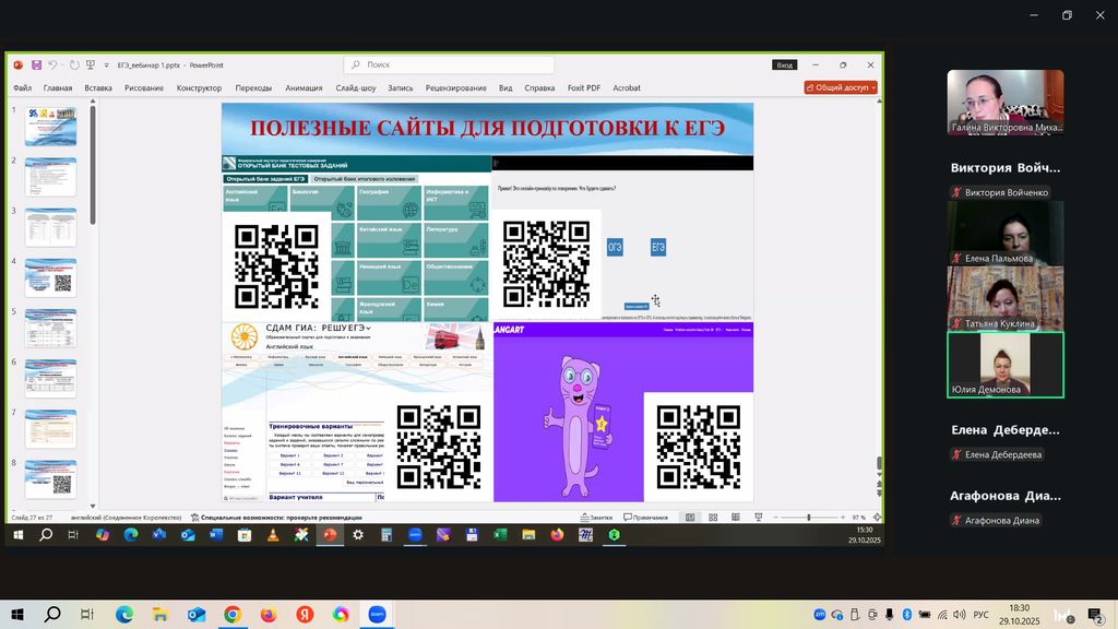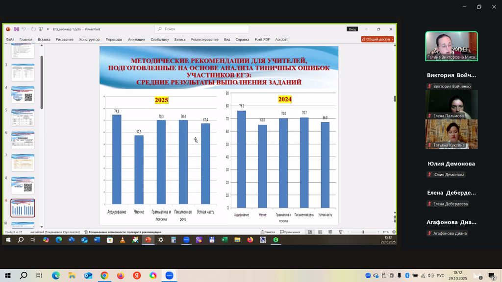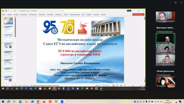 Новости все 30 октября, 2025 Начало работы «Методической онлайн школы: Сдаем ЕГЭ по английскому языку на максимум» на факультете иностранных языков29 октября на факультете иностранных языков состоялся научный обучающий вебинар «ЕГЭ 2026 по английскому языку: структура и содержание КИМ» в рамках образовательного проекта «Методическая онлайн школа: Сдаем ЕГЭ по английскому языку на максимум». Организатором вебинара выступила кафедра английского языка. Цель вебинара – методическое консультирование школьников, учителей и родителей по вопросам подготовки обучающихся 10-11-х классов к сдаче ЕГЭ по английскому языку в 2026 году. Особое внимание в работе вебинара было уделено: · структуре и содержанию КИМ ЕГЭ 2026 года по английскому языку; · особенностям подсчёта баллов за выполнение заданий ЕГЭ 2026 по английскому языку; · методическому разбору актуальной демоверсии ЕГЭ по английскому языку; · современным требованиям к выполнению заданий ЕГЭ 2026 по английскому. С приветственным обращенем к участникам вебинара выступили декан факультета иностранных языков О.В. Кравец и зав. кафедрой английского языка Ю.М. Тимошенко. Доцент кафедры английского языка Г.В. Михалева выступила с докладом на тему «ЕГЭ 2026 по английскому языку: структура и содержание КИМ». В работе вебинара приняли участие преподаватели кафедры английского языка и кафедры немецкого и французского языков (Дебердеева Е.Е., Войченко В.М., Савицкая А.Н., Щитова Н.Г., Жуковская Н.В., Кликушина Т.Г., Полякова Е.В., Пальмова Е.А., Павленко Л.Г., Павленко А.Е., Плотникова Г.С., Аханова М.Г., Касич М.А., Кравченко О.В., Куклина Т.В.), а также школьники, учителя, студенты и магистранты факультета иностранных языков. Следующий методический вебинар состоится 26 ноября 2025 г. (среда) в 19.00 (МСК). Тема следующего вебинара: «Письменная часть ЕГЭ-2026 по английскому языку: электронное письмо». Благодарим участников вебинара за активное участие в мероприятии! До новых встреч! |