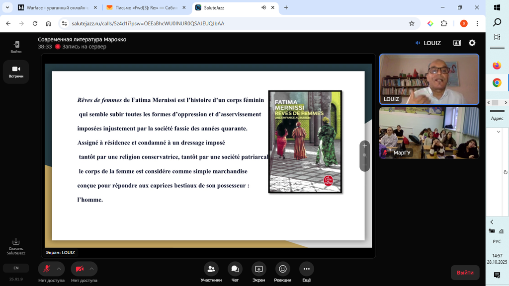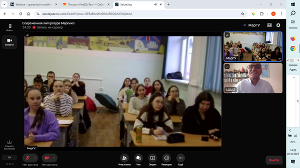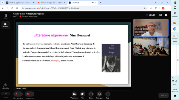 Новости все 30 октября, 2025 Участие студентов факультета иностранных языков в онлайн-семинаре «La litterature maghrebine feminine»28 октября кафедра немецкого и французского языков в рамках реализации плана мероприятий по сотрудничеству с институтом иностранных языков Петрозаводского государственного университета получила возможность приобщить студентов к миру франкофонной культуры. Студенты-франкофоны группы ПЕР-341 с преподавателями кафедры О.В. Кравченко, Т.Э. Бурок стали участниками онлайн-семинара по франкофонной литературе «La litterature maghrebine feminine». Лектором выступил г-н Луис Дрисс (г. Кенитра, Марокко), преподаватель Университета Ибн Тофаила. Л. Дрисс погрузил присутствующих в атмосферу стран Магриба, познакомил с особенностями творчества писателей, уделив особое внимание роли женщин-писательниц в арабской литературе на французском языке и тем проблемам, которые затронуты в наиболее известных произведениях. Манера изложения лектора, визуализация представляемого материала обеспечило заинтересованность аудитории. В последующем обсуждении затронутых вопросов приняли участие студенты Марийского государственного университета, Петрозаводского государственного университета и студенты факультета иностранных языков Таганрогского института имени А.П. Чехова. Кафедра немецкого и французского языков благодарит г-на Луиса Дрисса за познавательную лекцию и коллег из ПетрГУ за приглашение и полученную возможность коммуникации на французском языке. |