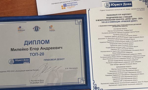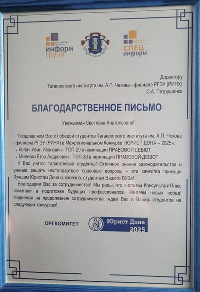 Новости все 30 декабря, 2025 Победа студента-первокурсника направления подготовки «Юриспруденция» в межрегиональном конкурсе «Юрист Дона – 2025»18 декабря 2025 года были подведены итоги ежегодного межрегионального юридического конкурса «Юрист Дона». За победу в номинациях «Правовой дебют» и «Профессионал» боролись около 800 претендентов из Ростовской и Воронежской областей. Конкурс проходил онлайн в два этапа. Номинация «Правовой дебют» собрала 437 студентов ведущих вузов Дона. Студент первого курса факультета экономики и права Таганрогского института имени А.П. Чехова Егор Милейко одержал победу в конкурсе «Юрист Дона – 2025» ТОП-20 в номинации «Правовой дебют». Научным руководителем выступила канд. филос. наук, доцент, куратор группы ЮР-611 В.А. Тимофеенко. Е.А. Милейко был награжден дипломом, а директору Таганрогского института имени А.П. Чехова (филиал) «РГЭУ (РИНХ)» С.А. Петрушенко вручили благодарственное письмо. Поздравляем Е.А. Милейко и его научного руководителя с победой и желаем дальнейших профессиональных свершений! |