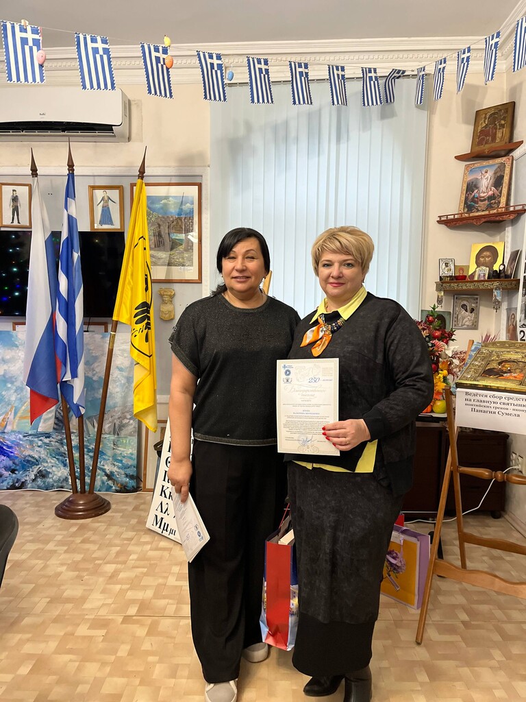 Благодарственное письмо и памятные подарки были вручены также декану факультета истории и филологии, канд.ист.наук В.А. Агеевой. Валентина Анатольевна отметила, что греческая история и традиции — это важный элемент культурного кода Ростовской области, и их изучение является ключевым для понимания регионального наследия. В завершение декан выразила искреннюю благодарность Мелине Пантелеевне за многолетнее и плодотворное сотрудничество и поздравила всех с наступающим Новым годом!