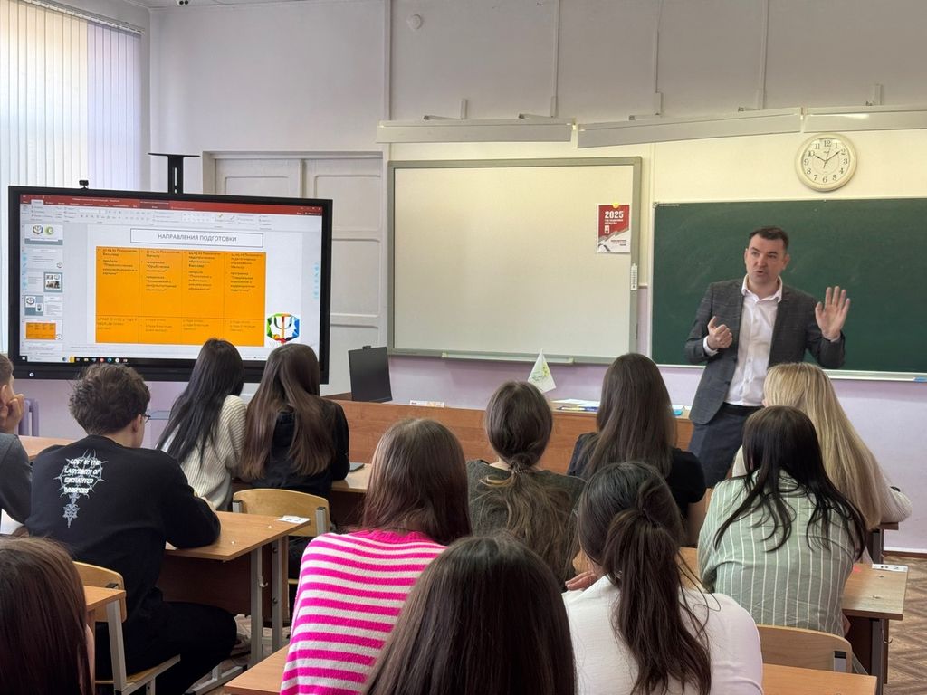 Профориентационная встреча доц. кафедры психологии А.В. Макарова со старшеклассниками МОБУ СОШ № 2620 марта 2025 г., в Международный день счастья, состоялась профориентационная встреча доц. кафедры психологии А.В. Макарова с обучающимися 10 и 11 классов МОБУ СОШ № 26 г. Таганрога. Для старшеклассников студентами группы ПСХ-521 была подготовлена презентация двух образовательных программ «Психологическое консультирование и коучинг» и «Психология и педагогика инклюзивного образования». Обучающихся заинтересовали вопросы, касающиеся базовых навыков психолога-консультанта и коуча, основных принципов и ценностей коучинга. Их вниманию был представлен видеоролик, подготовленный студентами группы ПСХ-531, раскрывающий основные этапы проведения коуч-сессии. Отвечая на вопросы школьников, А.В. Макаров предложил ознакомиться с информацией, содержащейся в профориентационных буклетах, и пригласил присутствующих на факультет психологии и социальной педагогики. |