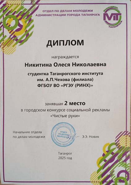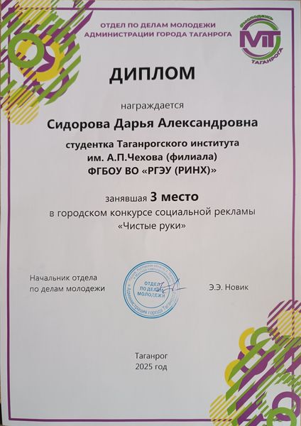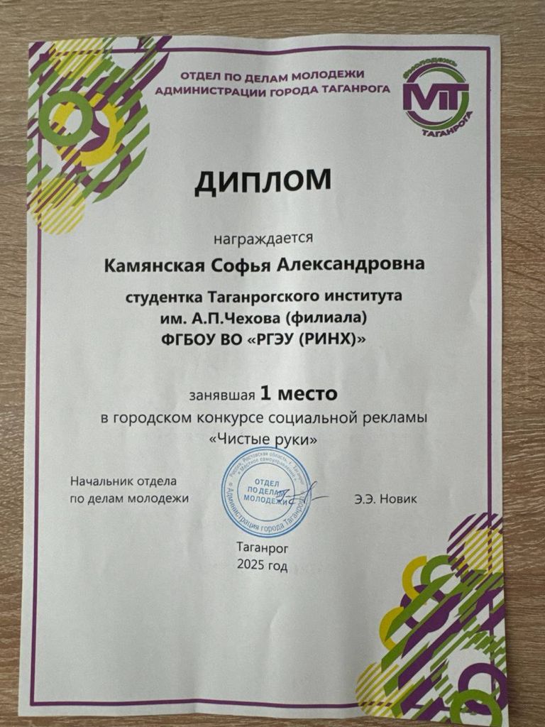 Новости все 01 ноября, 2025 Победа студентов факультета экономики и права в городском конкурсе «Чистые руки»Студенты первого курса направления подготовки «Юриспруденция» под руководством куратора В.А. Тимофеенко приняли участие в городском конкурсе социальной рекламы «Чистые руки», организатором которого выступил отдел по делам молодежи Администрации города Таганрога. Цель конкурса – привлечение творческого потенциала молодежи к деятельности, направленной на снижение правового нигилизма среди населения, формирование антикоррупционного общественного мнения и нетерпимости к коррупционному поведению. Участники конкурса – обучающиеся общеобразовательных организаций, а также студенты образовательных организаций высшего и профессионального образования города Таганрога. В номинации «Лучший проект антикоррупционного мероприятия» победителем стали: 1 место – Камянская Софья Александровна (студентка Таганрогского института имени А.П. Чехова (филиала) ФГБОУ ВО «РГЭУ (РИНХ)»); 2 место – Никитина Олеся Николаевна (студентка Таганрогского института имени А.П. Чехова (филиала) ФГБОУ ВО «РГЭУ (РИНХ)»); 3 место – Сидорова Дарья Александровна (студентка Таганрогского института имени А.П. Чехова (филиала) ФГБОУ ВО «РГЭУ (РИНХ)»). Победителей городского конкурса наградили соответствующими дипломами и памятными подарками от отдела молодежи. Работа Камянской Софьи, занявшей 1 место, была направлена на областной этап конкурса. Поздравляем студентов и их научного руководителя В.А. Тимофеенко с победой! |