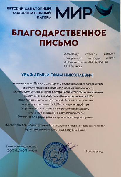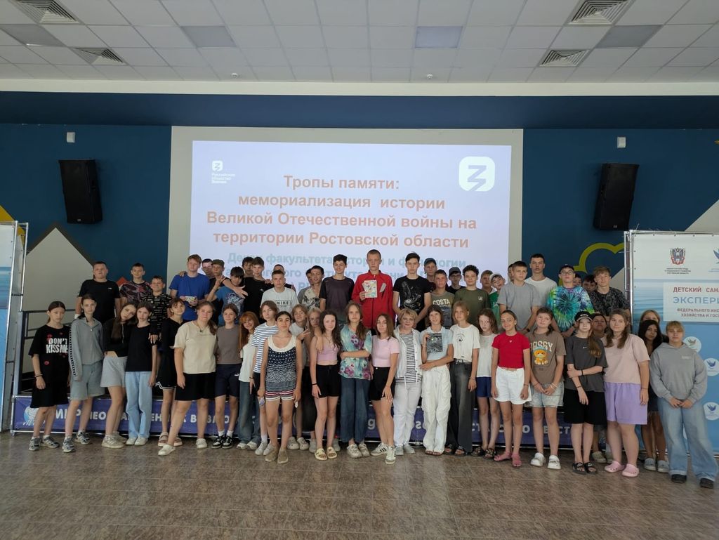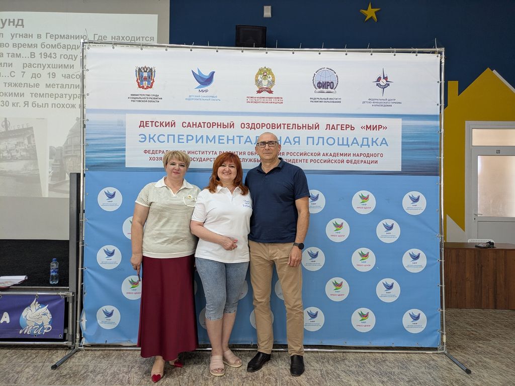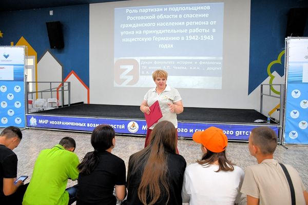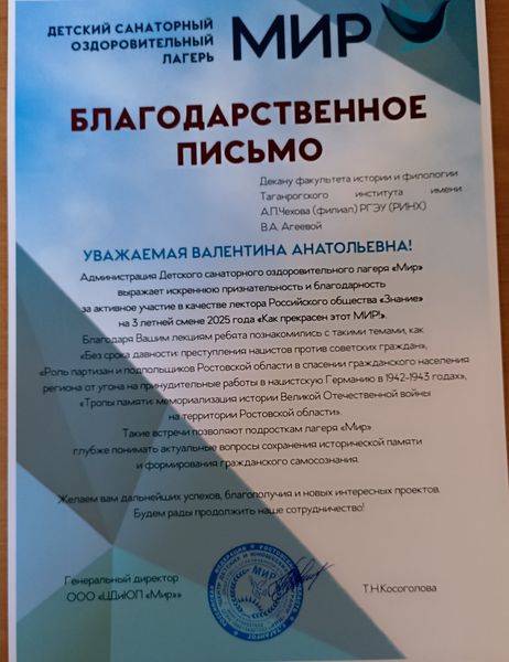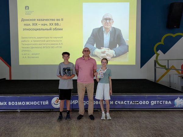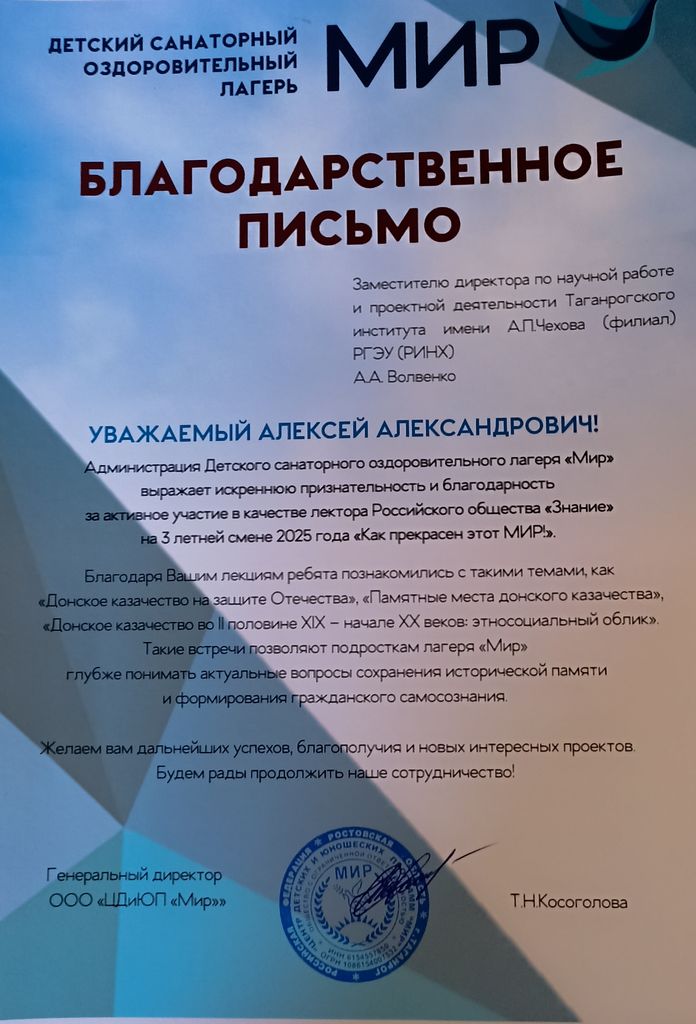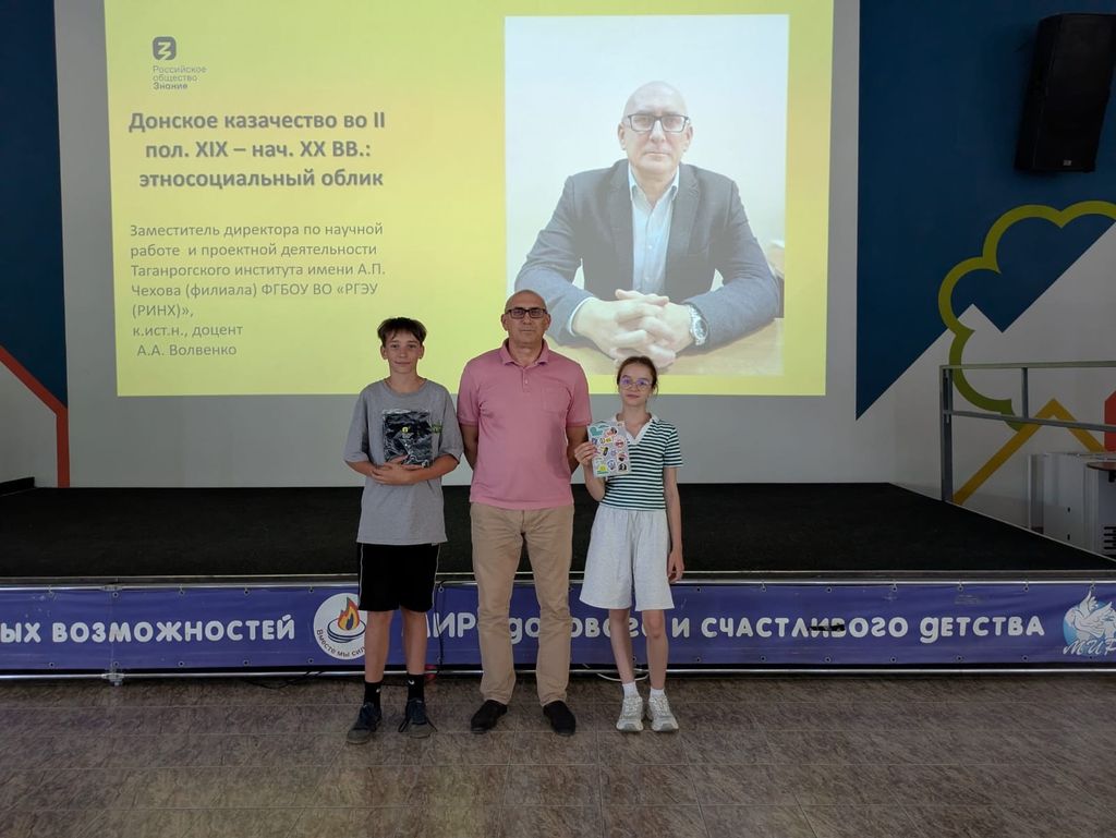 Новости все 05 августа, 2025 Историческое просвещение в рамках социального партнерстваАдминистрация детского санаторно оздоровительного лагеря «Мир» в лице генерального директора Т. Н. Косоголовой выразила благодарность за активное участие в образовательной составляющей программы третьей летней смены «Как прекрасен этот МИР!» руководителю научной лаборатории «Казачество в истории и памяти» факультета истории и филологии, руководителю магистерской программы «Историческое образование в системе казачьих кадетских учебных заведений», заместителю директора по научной работе и проектной деятельности Таганрогского института имени А.П. Чехова (филиала) РГЭУ (РИНХ), председателю общественного совета при Департаменте по делам казачества и кадетских учебных заведений РО, кандидату исторических наук, доценту А. А. Волвенко; кандидату исторических наук, доценту, декану факультета истории и филологии Таганрогского института имени А. П. Чехова (филиала) РГЭУ (РИНХ), члену общественного совета при комитете по управлению архивным делом Ростовской области В.А. Агеевой и преподавателю кафедры истории, призёру V Межрегионального конкурса «Лучший молодой преподаватель Юга России 2025» Е. Н. Капканову. В качестве лекторов Российского общества «Знание» они прочитали серию лекций по истории казачества, Великой Отечественной войны, по экологии и по историко-культурному и образовательному туризму. |