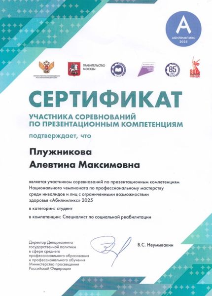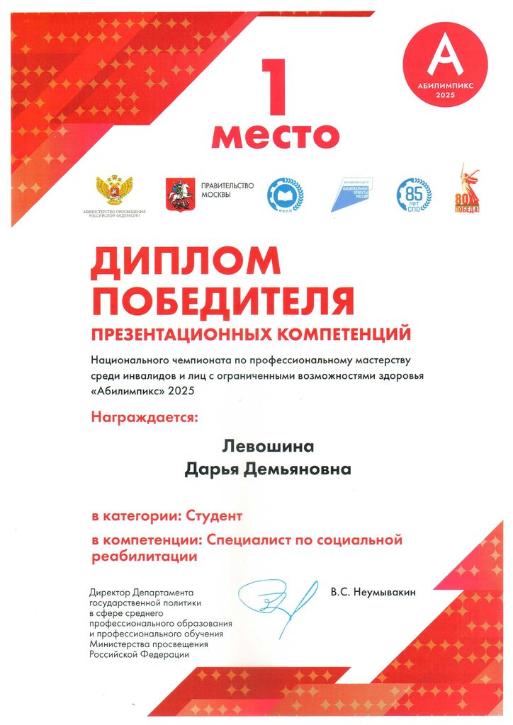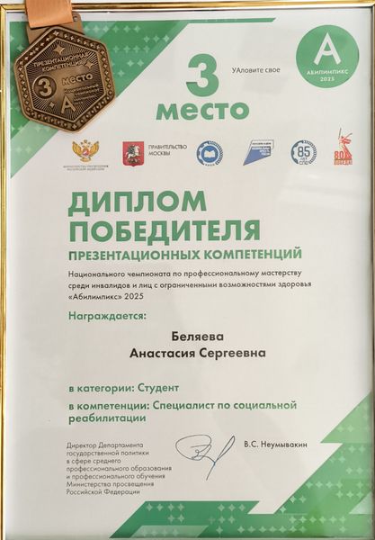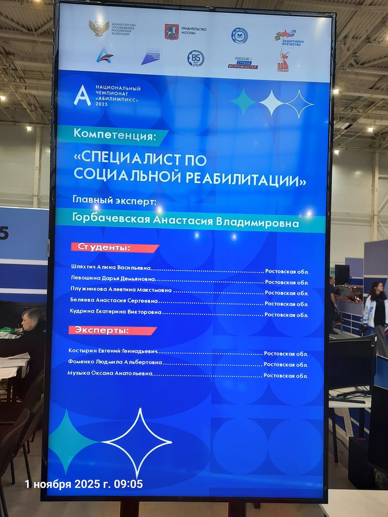 Новости все 07 ноября, 2025 Победа в Национальном чемпионате профмастерства «Абилимпикс» команды студентов факультета психологии и социальной педагогики и РГЭУ (РИНХ) под руководством декана и эксперта Музыка О.А.С 30 октября по 2 ноября 2025 года в Москве на площадке «Тимирязев Центр» проходил финал Национального чемпионата профессионального мастерства среди студентов с ОВЗ и инвалидностью. В соревнованиях приняли участие свыше 1 000 конкурсантов — школьники от 14 лет, студенты СПО и вузов, а также работающие граждане с инвалидностью или ОВЗ по разным номинациям и направлениям. Ростовский государственный экономический университет «РГЭУ (РИНХ)» и Таганрогский институт имени А.П. Чехова представляла команда студентов под руководством декана факультета психологии и социальной педагогики, наставника студентов и эксперта, д-ра филос. наук, профессора Музыка Оксаны Анатольевны: Беляева Анастасия (магистрант ППОGZ-513), Плужникова Алевтина (магистрант ППОGZ-513), Левошина Дарья (ПСХ-531), Носова Анна и Сухарева Ксения (РГЭУ «РИНХ»). Из 5-ти участников чемпионата четверо стали победителями и медалистами. В компетенции «Специалист по социальной реабилитации» победителем стала Левошина Дарья, 3-е место получила Беляева Анастасия. В компетенции «Специалист по финансам общественного сектора» 2-е место заняла Носова Анна, 3-е место – Сухарева Ксения. Поздравляем победителей с высоким результатом! Желаем не останавливаться в развитии и покорять новые профессиональные горизонты! Профессорско-преподавательский состав университета и института гордится своими учениками! |