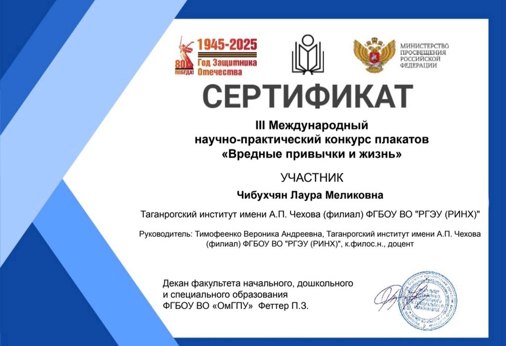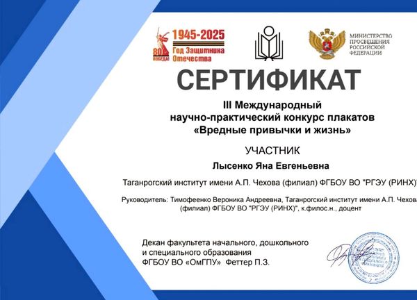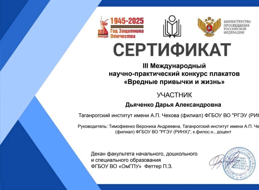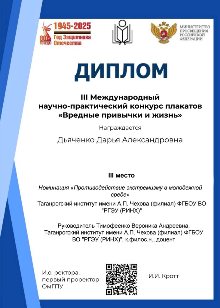 Новости все 13 мая, 2025 Победа в III Международном научно-практическом конкурсе плакатов «Вредные привычки и жизнь»13 мая 2025 г. организаторы – Омский государственный педагогический университет и Российский университет дружбы народов – объявили результаты III Международного научно-практического конкурса плакатов «Вредные привычки и жизнь», в котором приняли участие студенты 1 курса направления подготовки «Юриспруденция» под руководством куратора В.А. Тимофеенко. Они подготовили и отправили работы в нескольких номинациях: популяризация ЗОЖ в молодежной среде; влияние вредных привычек на организм человека; противодействие экстремизму в молодежной среде. На конкурс было представлено 598 творческих работ обучающихся из Российской Федерации, в том числе представителей новых регионов Российской Федерации – Донецкой Народной Республики, а также зарубежные участники представили работы из 33 стран мира. Дипломом за III место награждена студентка гр. ЮР-611 Дарья Дьяченко в номинации: «Противодействие экстремизму в молодёжной среде». Сертификатами участника отмечены Яна Лысенко, Лаура Чибухчян. Организаторы конкурса поздравляют победителей и их научных руководителей и благодарят за сотрудничество всех принявших участие в конкурсе! |