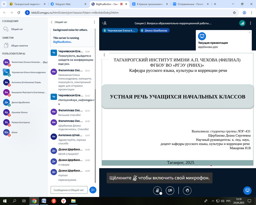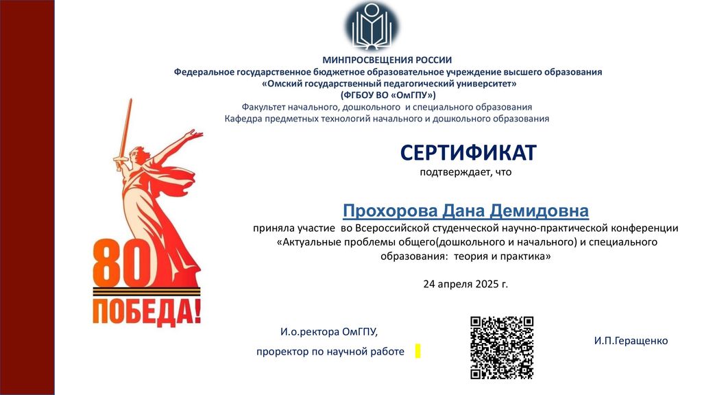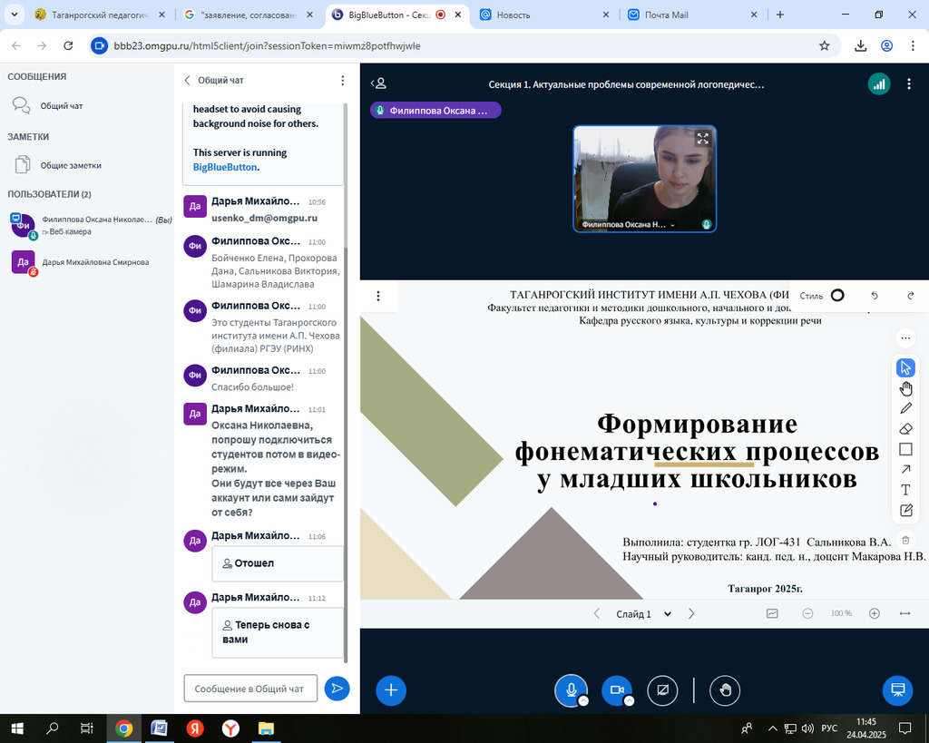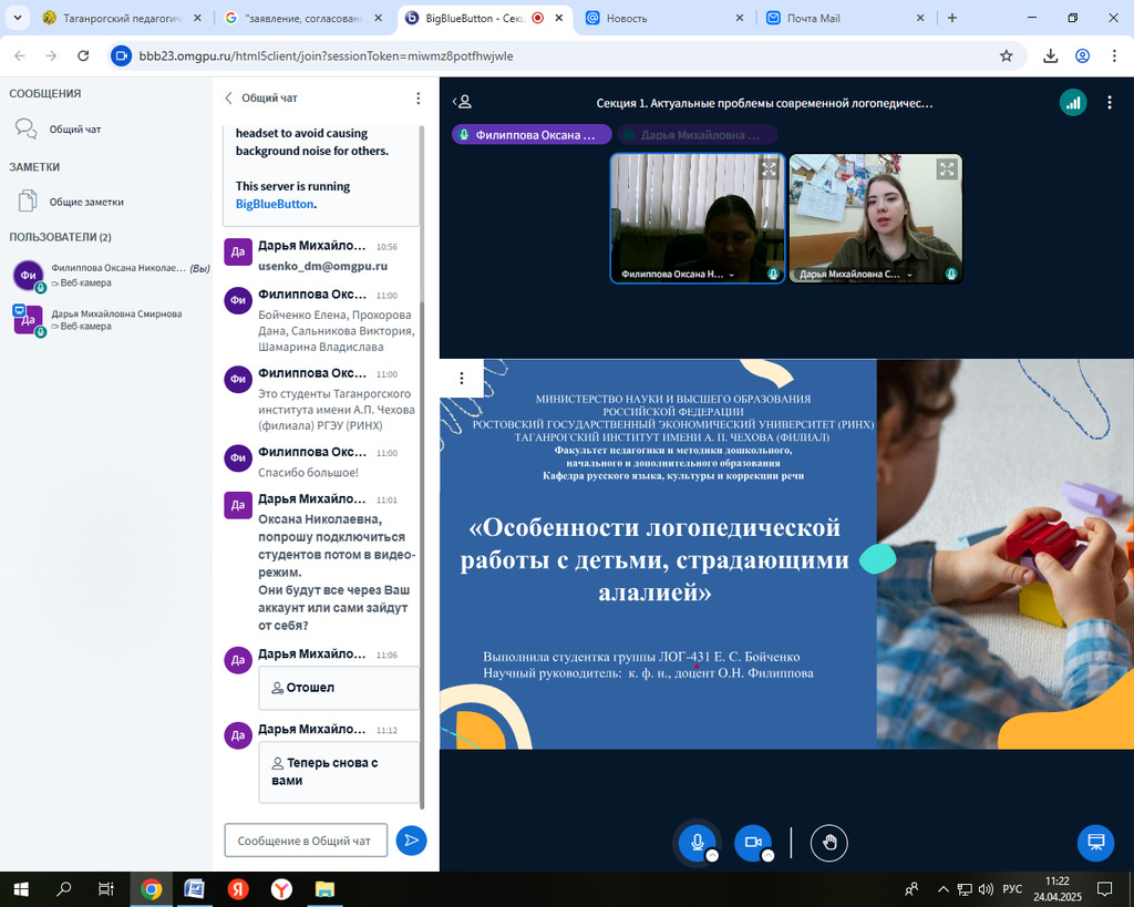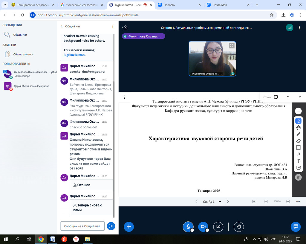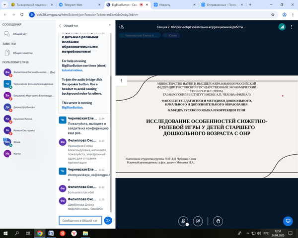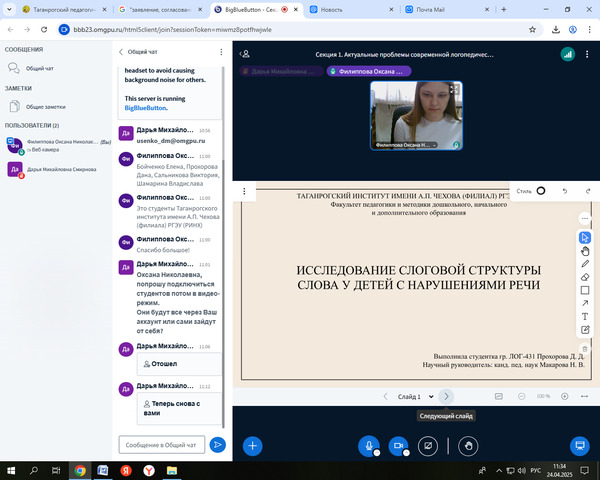 Новости все 15 мая, 2025 Участие студентов профиля «Логопедия» во Всероссийской студенческой научно-практической конференции «Актуальные проблемы общего (дошкольного и начального) и специального образования: теория и практика» (г. Омск)24 апреля 2025 года на базе ФГБОУ ВО «Омский государственный педагогический университет» прошла Всероссийская студенческая научно-практическая конференция «Актуальные проблемы общего (дошкольного и начального) и специального образования: теория и практика», в которой приняли участие студенты 3-го курса Таганрогского института имени А.П.Чехова (филиала) РГЭУ (РИНХ), профиль «Логопедия». На секции «Актуальные проблемы современной логопедической теории и практики» выступили: – Бойченко Елена, представившая доклад на тему «Особенности логопедической работы с детьми, страдающими алалией» (научный руководитель – канд. филол. наук, доцент кафедры русского языка, культуры и коррекции речи О.Н. Филиппова); – Прохорова Дана, выступившая с докладом на тему «Исследование слоговой структуры слова у детей с нарушениями речи» (научный руководитель – канд. пед. наук, доцент кафедры русского языка, культуры и коррекции речи Н.В. Макарова); – Сальникова Виктория, представившая доклад на тему «Формирование фонематических процессов у младших школьников» (научный руководитель – канд. пед. наук, доцент кафедры русского языка, культуры и коррекции речи Н.В. Макарова); – Шамарина Владислава, выступившая с докладом на тему «Характеристика звуковой стороны речи детей» (научный руководитель – канд. пед. наук, доцент кафедры русского языка, культуры и коррекции речи Н.В. Макарова). На секции «Вопросы образовательно-коррекционной работы с детьми с разными особыми образовательными потребностями» выступили: – Чубенко Юлия, представившая доклад на тему «Исследование особенностей сюжетно-ролевой игры у детей старшего дошкольного возраста с ОНР» (научный руководитель – канд. филол. наук, доцент кафедры русского языка, культуры и коррекции речи Н.А. Минаева); – Щербакова Диана, выступившая с докладом на тему «Устная речь учащихся начальных классов» (научный руководитель – канд. пед. наук, доцент кафедры русского языка, культуры и коррекции речи Н.В. Макарова). Каждый участник конференции представил результаты своего научного исследования широкой аудитории и получил ценную экспертную оценку. |