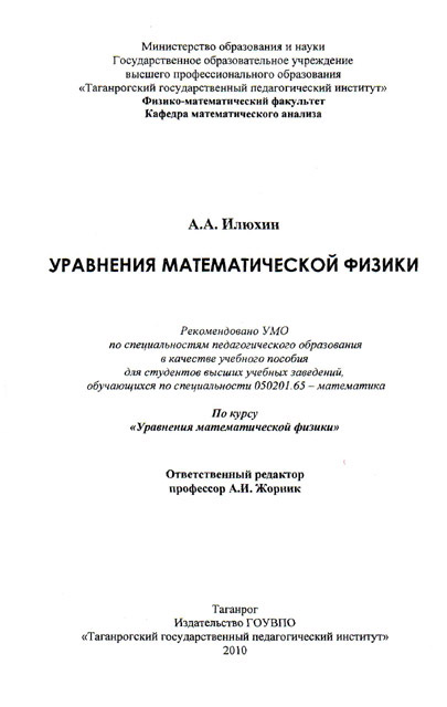 Новости все 21 января, 2011 Вышло в свет учебное пособие А.А. Илюхина «Уравнения математической физики», рекомендованное УМО по специальностям педагогического образования в качестве учебного пособия для студентов высших учебных заведений, обучающихся по специальности 050201.65 – «Математика с дополнительной специальностью» по курсу «Уравнения математической физики». Рецензентами пособия выступили известные в этой области ученые: заведующий отделом уравнений математической физики Института прикладной математики НАН Украины, доктор физико-математических наук А.Ф. Тедеев и профессор Российского государственного педагогического университета им. А.И. Герцена, доктор физико-математических наук В.Ф. Зайцев. Ответственным редактором пособия является профессор кафедры ТОФТ нашего института доктор физико-математических наук А.И. Жорник. Пособие содержит, кроме обычных для подобных пособий доказательств, некоторые новые доказательства важных положений УМФ, в частности, предложены доказательства, опирающиеся на первичные знания из общих курсов математики и даже из элементарной математики. Простота доказательств не наносит ущерб их строгости. Отдельно стоит указать на алгоритм приведения к каноническому виду уравнения эллиптического типа, который на порядок проще классического алгоритма, используемого во всех пособиях по этой дисциплине. В конце книги приведены высказывания крупных советских и российских ученых о значении и месте в системе знаний этой дисциплины, что в познавательном плане весьма полезно для специалистов по физике, математике, а также инженерам-конструкторам.