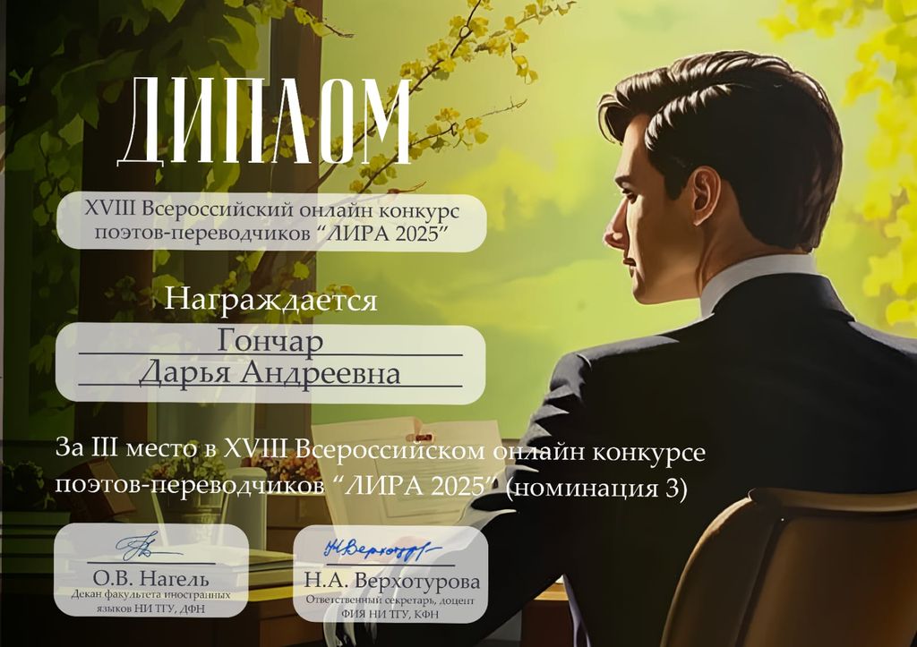 Новости все 22 апреля, 2025 Итоги VIII Всероссийского конкурса поэтов-переводчиков «ЛИРА 2025» «Перевести или пережить»Подведены итоги VIII Всероссийского конкурса поэтов-переводчиков «ЛИРА 2025» «Перевести или пережить», приуроченного к 135-летию Бориса Пастернака. В этом году на конкурс было подано почти 500 заявок для участия в 18 номинациях по переводу стихотворений Б. Пастернака на языки мира. Среди участников и победителей – студентка факультета иностранных языков Дарья Гончар (ИЯ-342). С переводом стихотворения Б. Пастернака на французский язык Дарья заняла III место. Кафедра немецкого и французского языков гордится, что талант, усердие и творчество Даши покорили жюри и желает новых свершений, вдохновения и радости от каждого переведённого слова! Пусть эта победа станет ступенькой к ещё большим успехам. НОМИНАЦИЯ 3. ПЕРЕВОД СТИХОТВОРЕНИЯ Б.Л. ПАСТЕРНАКА С РУССКОГО ЯЗЫКА НА ФРАНЦУЗСКИЙ Рассвет
