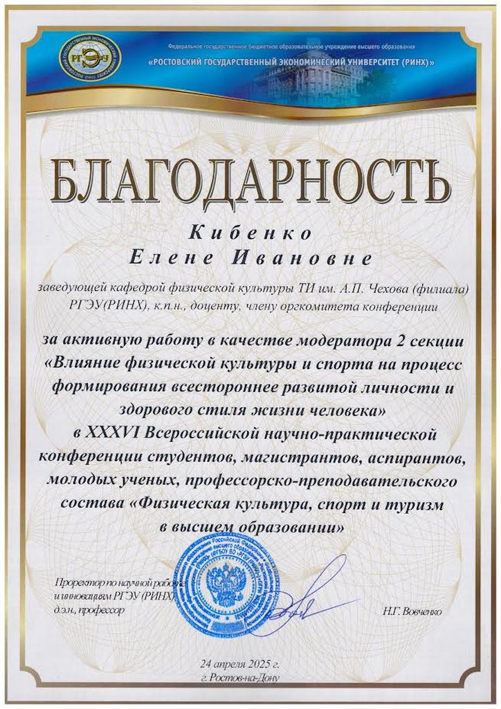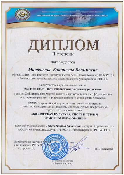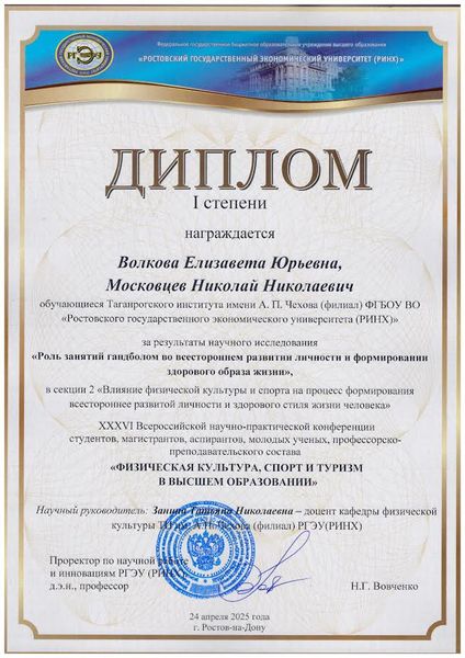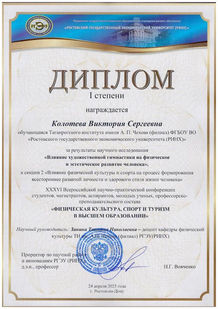 Новости все 26 мая, 2025 Достойное выступление студентов факультета физики, математики, информатики профилей «Физическая культура» и «Дополнительное образование (спортивная подготовка)» в XXXVI Всероссийской научно-практической конференции студентов, магистрантов, аспирантов, молодых ученых, профессорско-преподавательского состава «Физическая культура, спорт и туризм в высшем образовании»Стали известны результаты XXXVI Всероссийской научно-практической конференции студентов, магистрантов, аспирантов, молодых ученых, профессорско-преподавательского состава «Физическая культура, спорт и туризм в высшем образовании», которая проходила в смешанном формате 24-25 апреля 2025 г. в Ростовском государственном экономическом университете (РИНХ). Конференция проводится ежегодно согласно плану проведения конгрессов и конференций Министерства спорта Российской Федерации. В мероприятии приняли очно-заочное участие более 220 участников, география которых включает более чем 25 городов нашей страны, а также Республики Беларусь, Приднестровской Молдавской Республики, представители 51 организации высшего образования, СПО, спортивных школ. Таганрогский институт имени А. П. Чехова (филиал) РГЭУ (РИНХ) представляли студенты факультета физики, математики, информатики, профилей «Физическая культура» и «Дополнительное образование (спортивная подготовка)». Всего нашими студентами было заявлено 10 докладов. С докладами выступили: Колотева Виктория Сергеевна (ФСП-121), тема доклада «Влияние художественной гимнастики на физическое и эстетическое развитие человека». Научный руководитель – доцент кафедры физической культуры Т. Н. Занина. Кураева Полина Алексеевна (ФСП-121), Пеннер Эрика Михайловна, (ФСП-131), тема доклада «Эстетическое развитие обучающихся на уроках физической культуры с гимнастической направленностью». Научный руководитель – доцент кафедры физической культуры Т. Н. Занина. Матвеенко Алиса Вадимовна (ФСП-112), тема доклада «Хореография и здоровый образ жизни». Научный руководитель – старший преподаватель кафедры физической культуры П. В. Ткачук. Матвиенко Владислав Вадимович (ФСП-112), тема доклада «Занятия дзюдо – путь к нравственно-волевому развитию». Научный руководитель – старший преподаватель кафедры физической культуры П. В. Ткачук. Молчанов Иван Владимирович (ФСП-112), тема доклада «Альтернативные игры в физическом воспитании». Научный руководитель – старший преподаватель кафедры физической культуры П. В. Ткачук. Московцев Николай Николаевич (ФСП-131), Волкова Елизавета Юрьевна (ФСП-131), тема доклада «Роль занятий гандболом во всестороннем развитии личности и формировании здорового образа жизни». Научный руководитель – доцент кафедры физической культуры Т. Н. Занина. Фомин Максим Юрьевич (ФСП-121), Шостик Ляна Викторовна (ФСП-111), тема доклада «Мотивация к самостоятельным занятиям физической культурой студентов педагогических вузов». Научный руководитель – доцент кафедры физической культуры И. А. Сыроваткина. Московцев Николай Николаевич (ФСП-131), Волкова Елизавета Юрьевна (ФСП-131), тема доклада «Возможности инновационных технологий в сфере физической культуры и спорта». Научный руководитель – доцент кафедры физической культуры Т. Н. Занина. Фомин Максим Юрьевич (ФСП-121), тема доклада «Применение бос-тренинга направленного на сниж