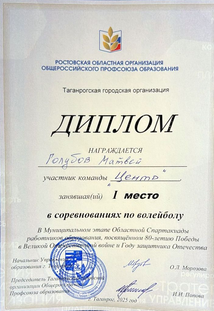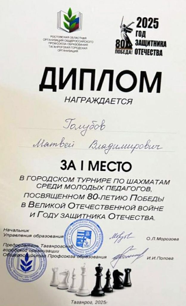 Новости все 27 октября, 2025 Студент факультета физики, математики, информатики Матвей Голубов стал победителем городского турнира по шахматам среди молодых педагогов и одержал в составе сборной команды «Центр» победу в соревнованиях муниципального этапа областной Спартакиады работников образования по волейболу24 октября в городе Таганроге прошел турнир по шахматам среди молодых педагогов, посвященный 80-летию Победы в Великой Отечественной войне и году защитника Отечества. Участником соревнований по шахматам среди молодых педагогов стал и наш студент третьего курса факультета физики, математики, информатики профилей «Физическая культура» и «Дополнительное образование (спортивная подготовка)» Матвей Голубов (ФФМИ, ФСП-131), который работает учителем физической культуры в МОБУ СОШ № 6 города Таганрога. По итогам соревнований Матвей Голубов в финале, в решающей партии, обыграл педагога из МАОУ гимназии имени А. П. Чехова, что позволило ему стать победителем городского турнира по шахматам среди молодых специалистов. Хочется также отметить, что 17 сентября Матвей в составе мужской сборной команды «Центр» завоевал 1 место в соревнованиях муниципального этапа областной Спартакиады работников образования по волейболу. ПОЗДРАВЛЯЕМ МАТВЕЯ С ДОСТОЙНЫМ СПОРТИВНЫМ РЕЗУЛЬТАТОМ! ЖЕЛАЕМ ЕМУ КРЕПКОГО ЗДОРОВЬЯ, УСПЕХОВ В УЧЕБЕ, ПЕДАГОГИЧЕСКОЙ ДЕЯТЕЛЬНОСТИ И СПОРТЕ! |